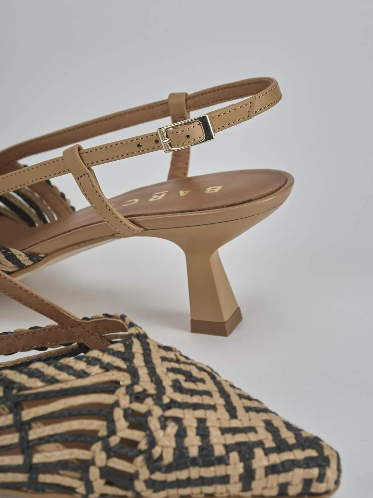 Slingback decolte’ tacco 5 cm fondo in leggerissima gomma e soletto interno in vera pelle. Tomaia in morbida pelle e rafia intrecciata a mano, punta sfilata, bicolor, scollo a ‘V’, cinturino con fibbia regolabile e tacco rocchetto per un look cool.