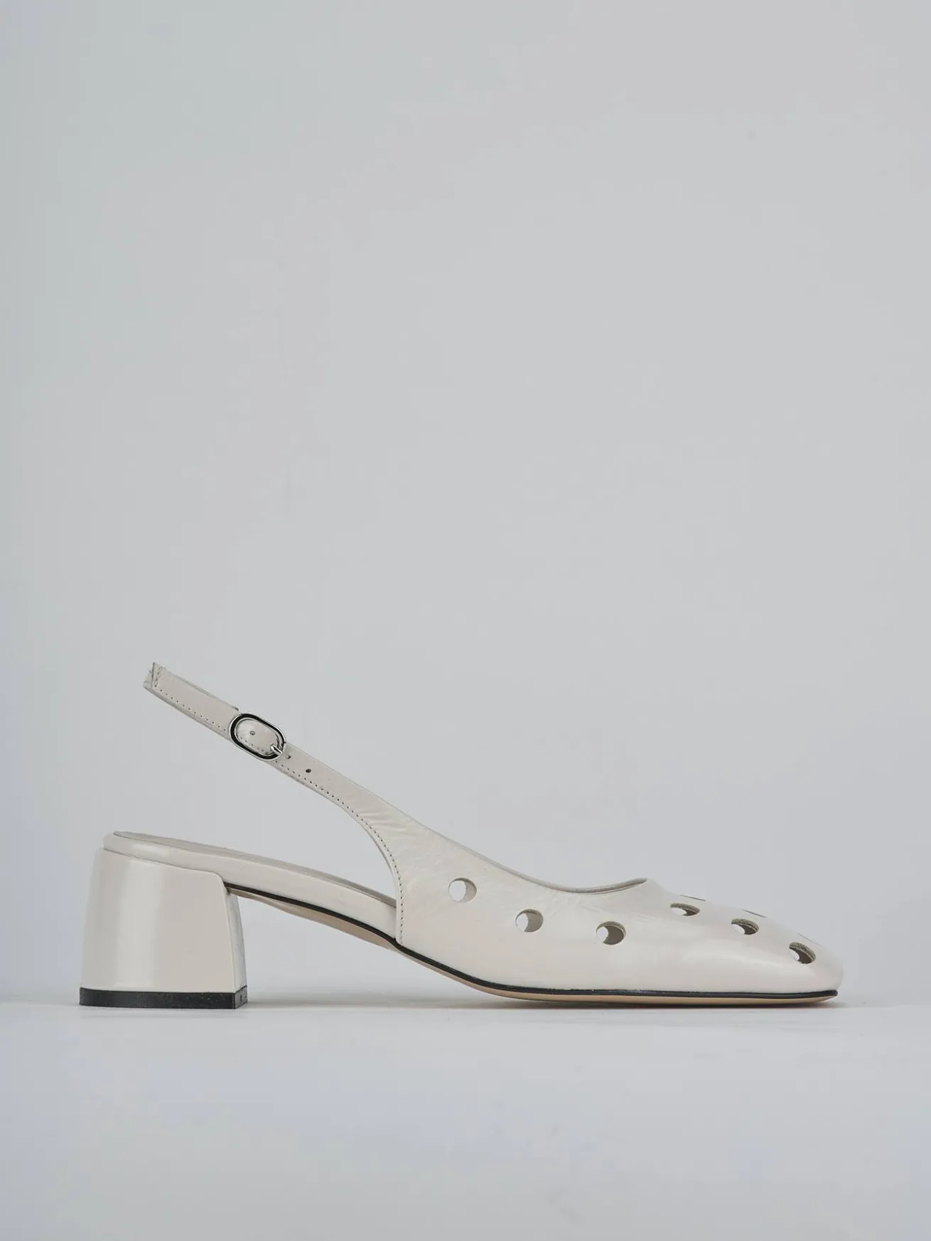 Slingback decolte’ tacco 4.5 cm fondo in leggerissima gomma e soletto interno in vera pelle. Tomaia in morbida pelle effetto verniciato, punta squadrata, scollo a ‘U’, fori a cerchio, cinturino sottile con fibbia regolabile e tacco grosso stabile per un look chic.