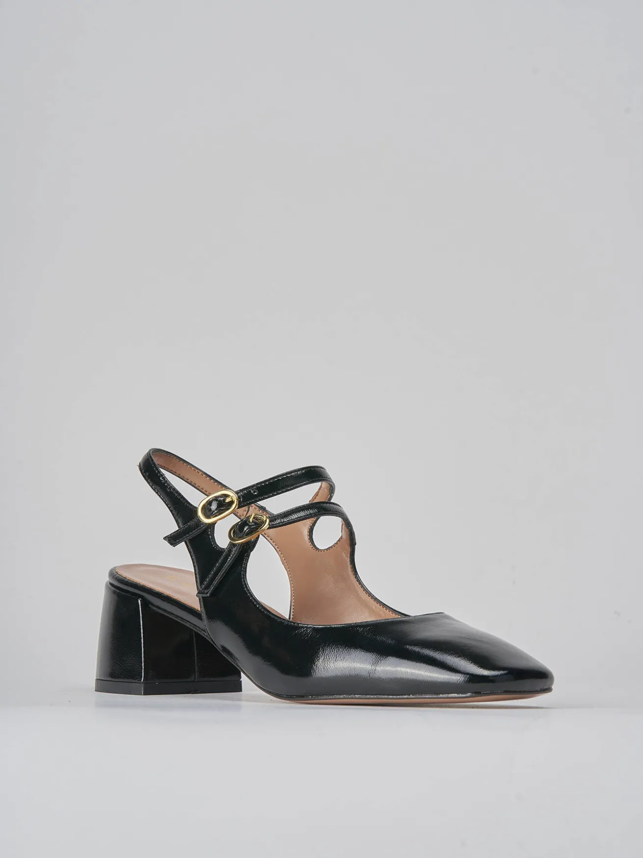Slingback maryjane tacco 4.5 cm fondo in cuoio e soletto interno in vera pelle. tomaia in morbida pelle effetto verniciato, punta leggermente squadrata, due cinturini sulla punta con fibbia regolabile e uno sul tallone elasticizzato e tacco grosso comodo per un look cool.