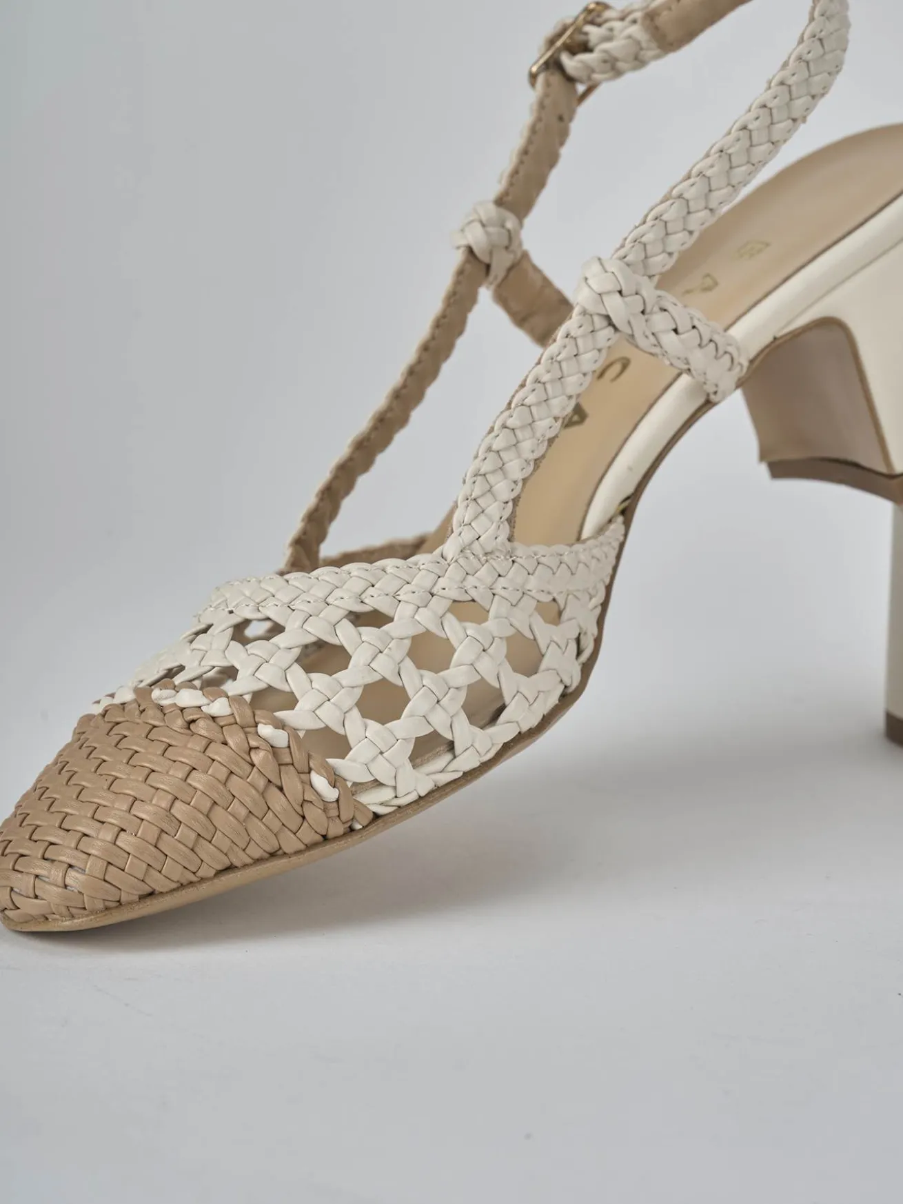 Slingback decolte’ tacco 6 cm fondo in leggera gomma e soletto interno in vera pelle. Tomaia in morbida pelle finemente intrecciata. punta affusolata, puntale, bicolor, cinturino con fibbia regolabile e tacco grosso. Perfetto con un vestito o una gonna.