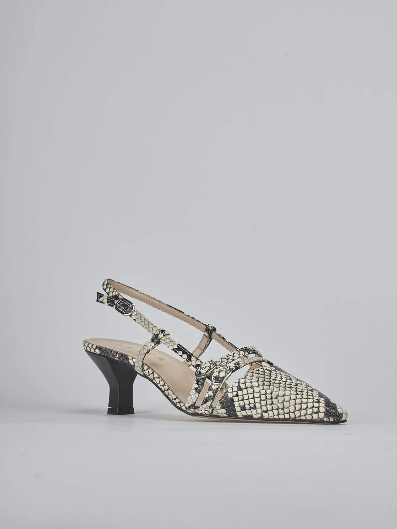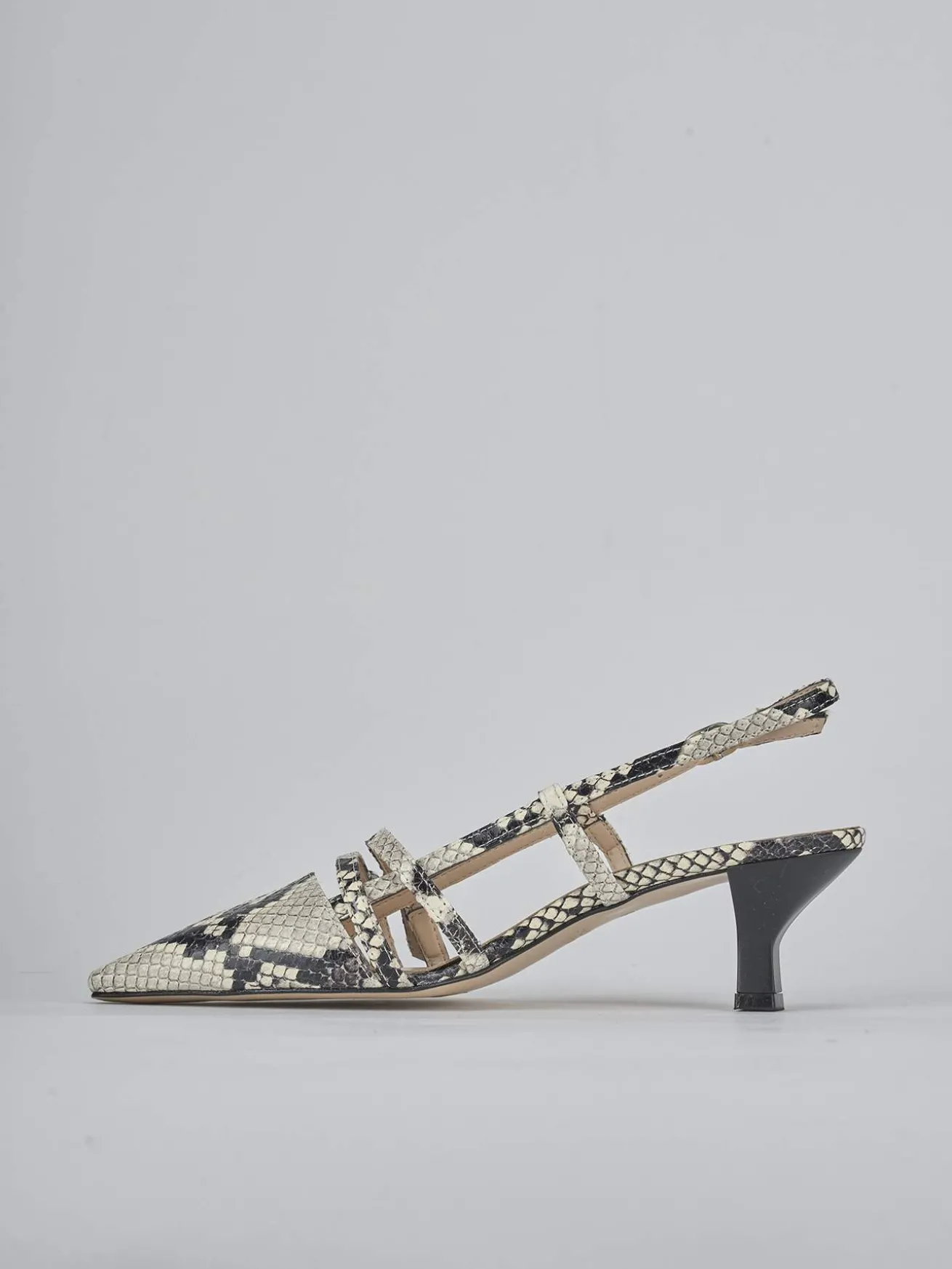 Slingback decolte’ tacco 6 cm fondo in cuoio e soletto interno in vera pelle. Tomaia in morbida pelle stampa pitonata, punta sfilata, puntale, due cinturini con fibbia regolabile sul collo del piede e cinturino sul tallone e comodo tacco rocchetto. Perfetto sia con dei jeans sia con un vestito.