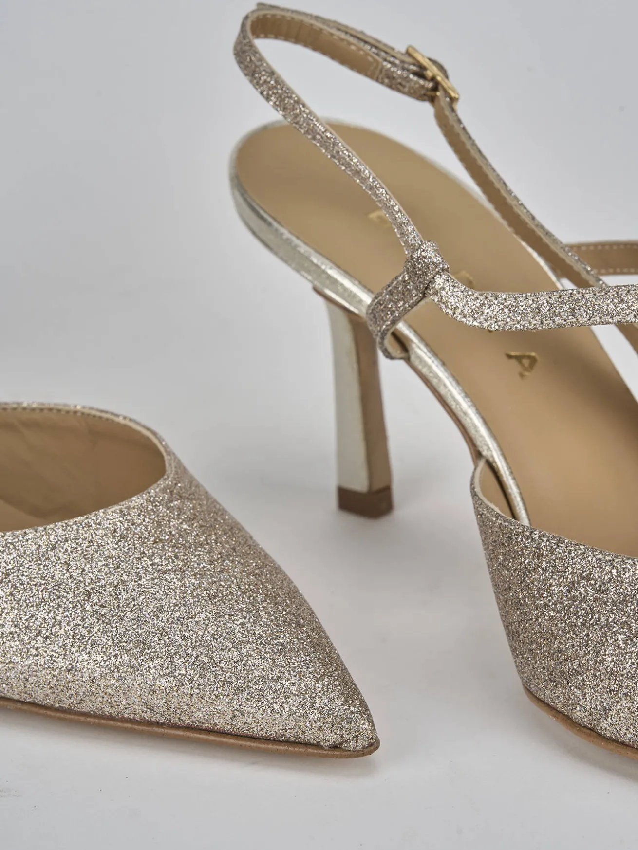 Slingback decolte’ tacco 7 cm fondo in cuoio e soletto interno in vera pelle. Tomaia in morbida pelle foderata di tessuto glitterato, punta sfilata, scollo a ‘U’, cinturino incrociato con fibbia regolabile e tacco fino. Perfetto per le tue serate più importanti.