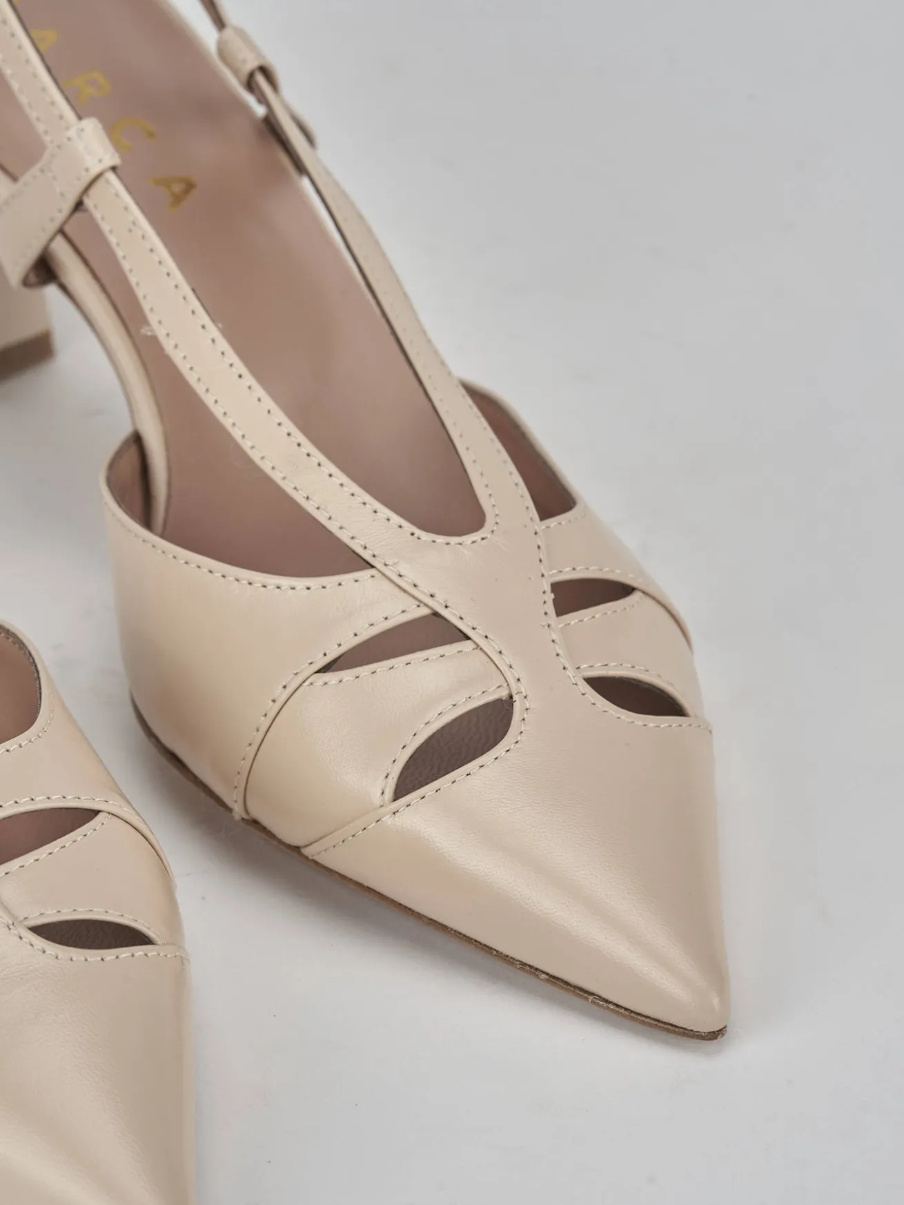 Slingback decolte’ tacco 6.5 cm fondo in cuoio e soletto interno in vera pelle. Tomaia in morbida pelle, punta sfilata, scollo a ‘V’ con cinturini uniti in punta, cinturino regolabile e tacco rocchetto per un look chic.