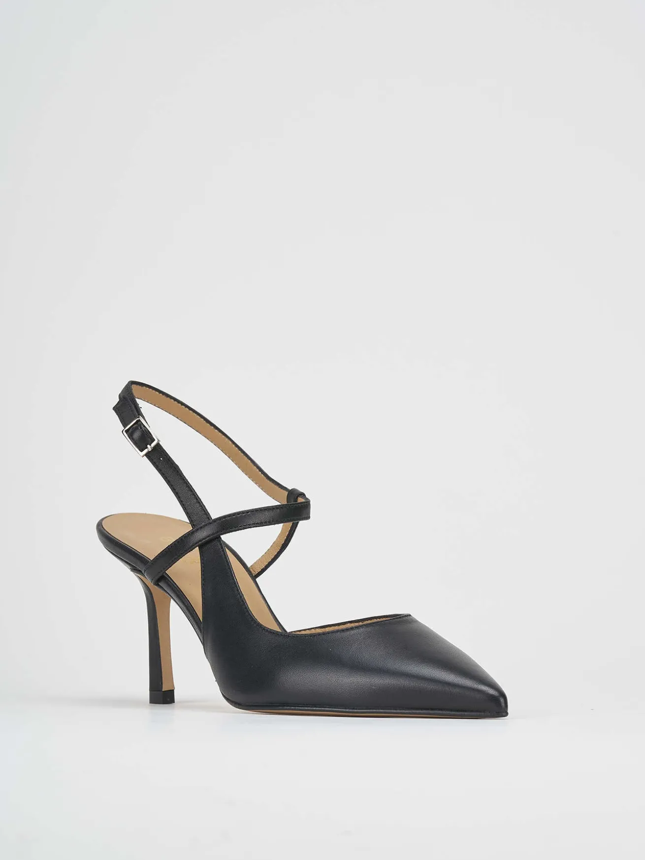 Slingback decolte tacco 7 cm fondo in cuoio e soletto interno in vera pelle. tomaia in morbida pelle, punta sfilata, cinturino incrociato sul collo del piede con fibbia regolabile, tacco fino per un look cool.