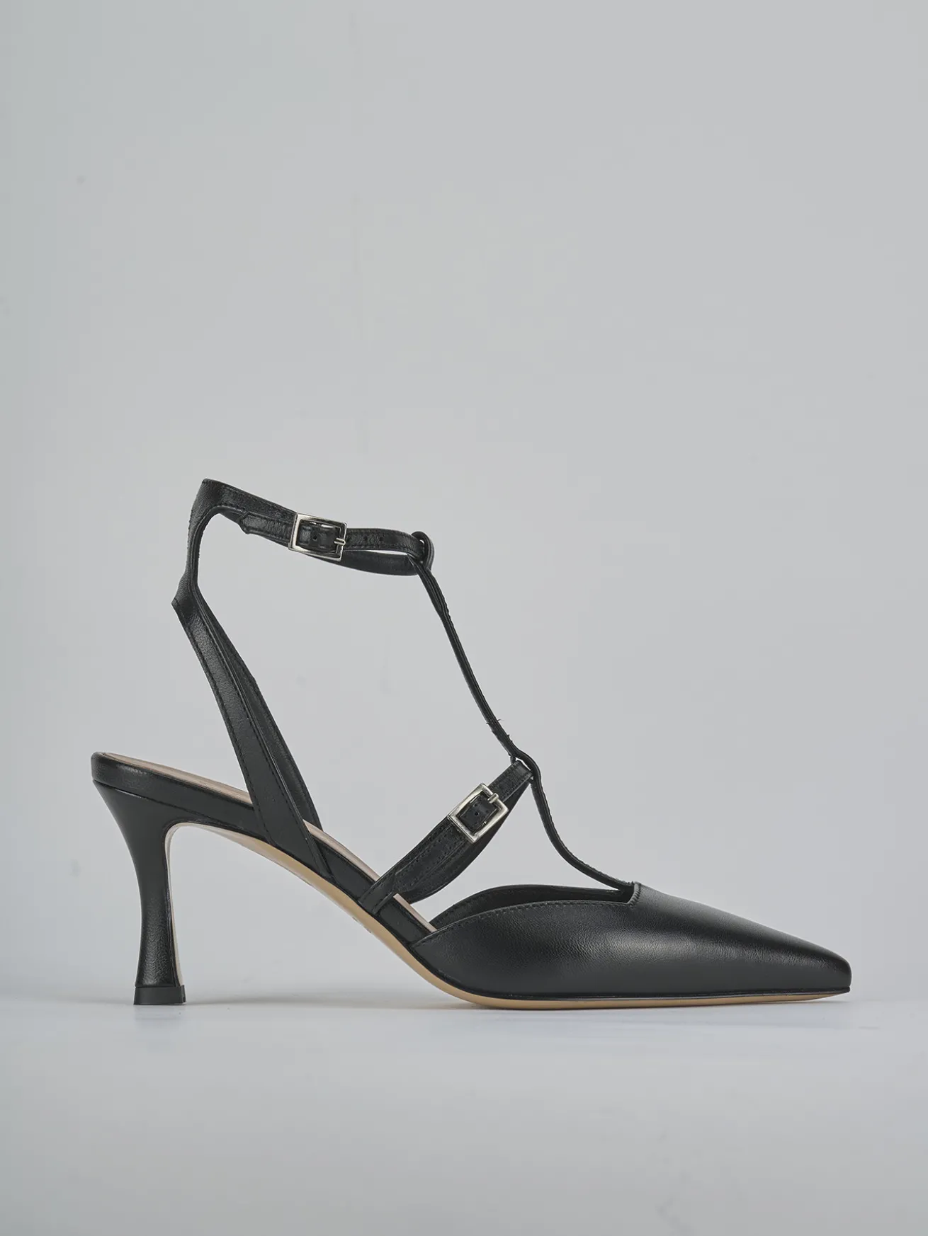 Slingback decolte’ tacco 8 cm fondo in cuoio e soletto interno in vera pelle. Tomaia in morbida pelle, punta sfilata, scollo squadrato, cinturino a ‘T’ che termina con fibbia regolabile altezza caviglia e tacco rocchetto. Perfetto con un vestito o una gonna midi.