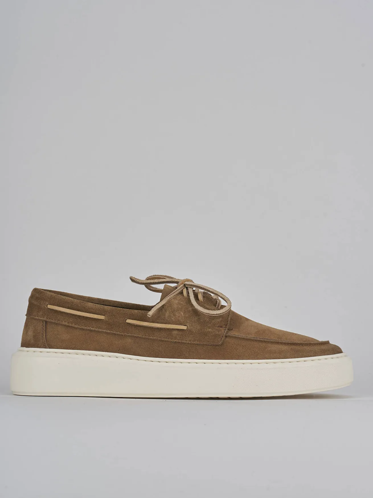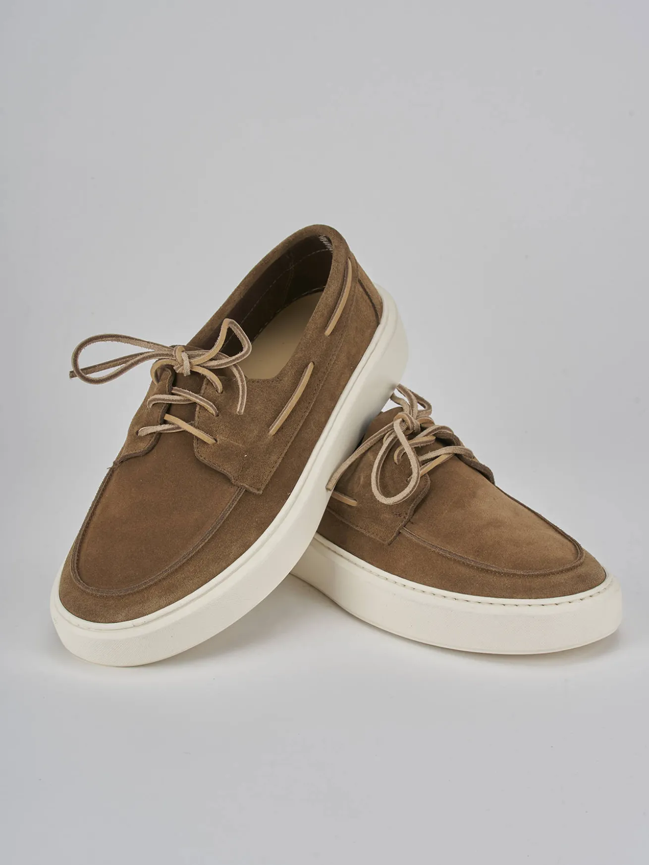 Realizzate in morbida pelle scamosciata, presentano una punta leggermente arrotondata e cuciture visibili che aggiungono un tocco di raffinatezza.