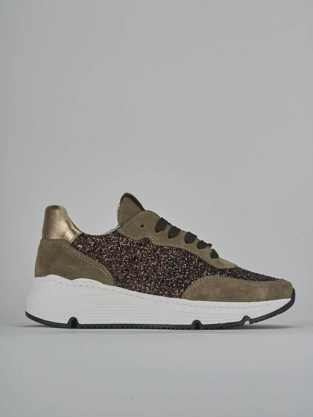 I riporti in camoscio e glitter esaltano ulteriormente la tomaia, mentre il topponcino a contrasto in pelle laminata aggiunge un elemento di lusso.
