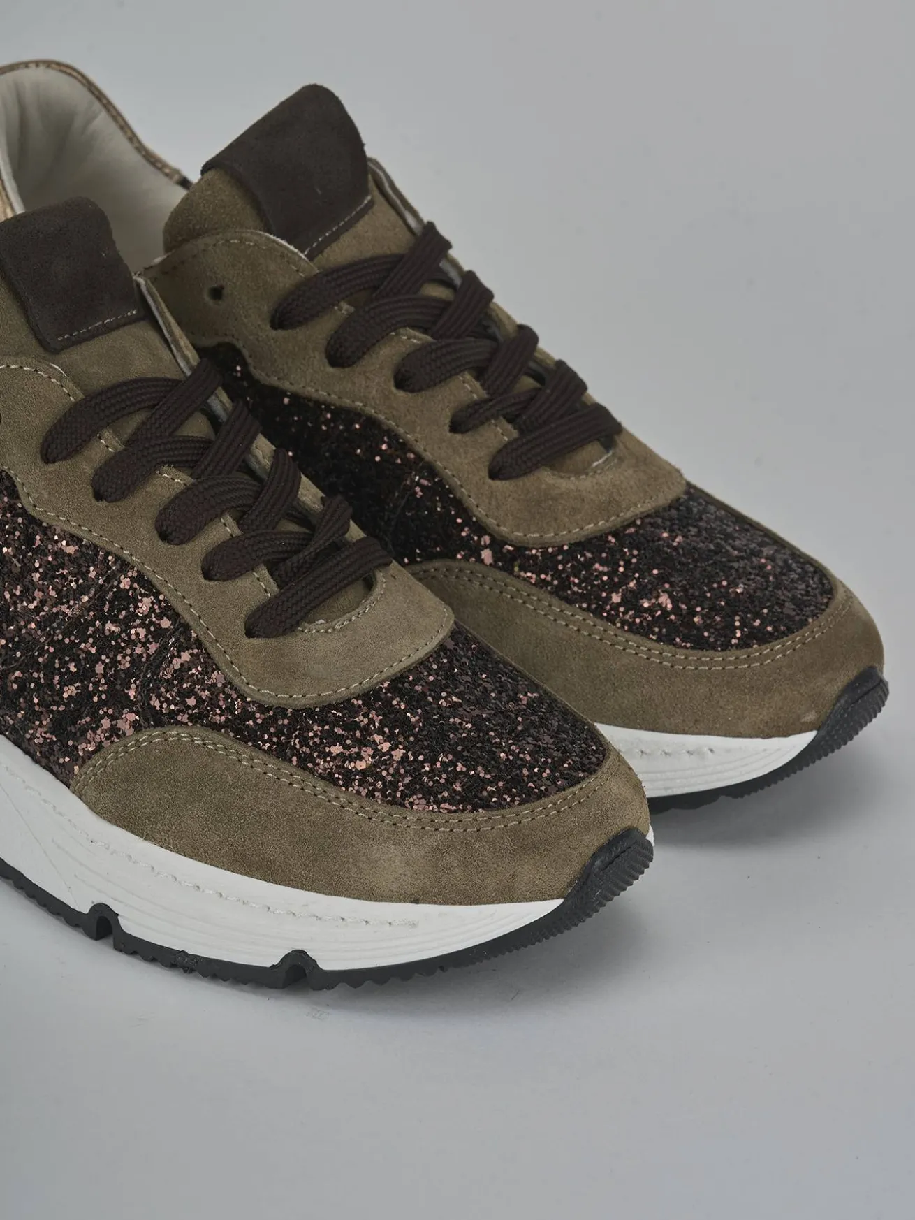La tomaia è realizzata in morbido camoscio, arricchita da dettagli glitterati che donano un tocco di brillantezza e stile.
