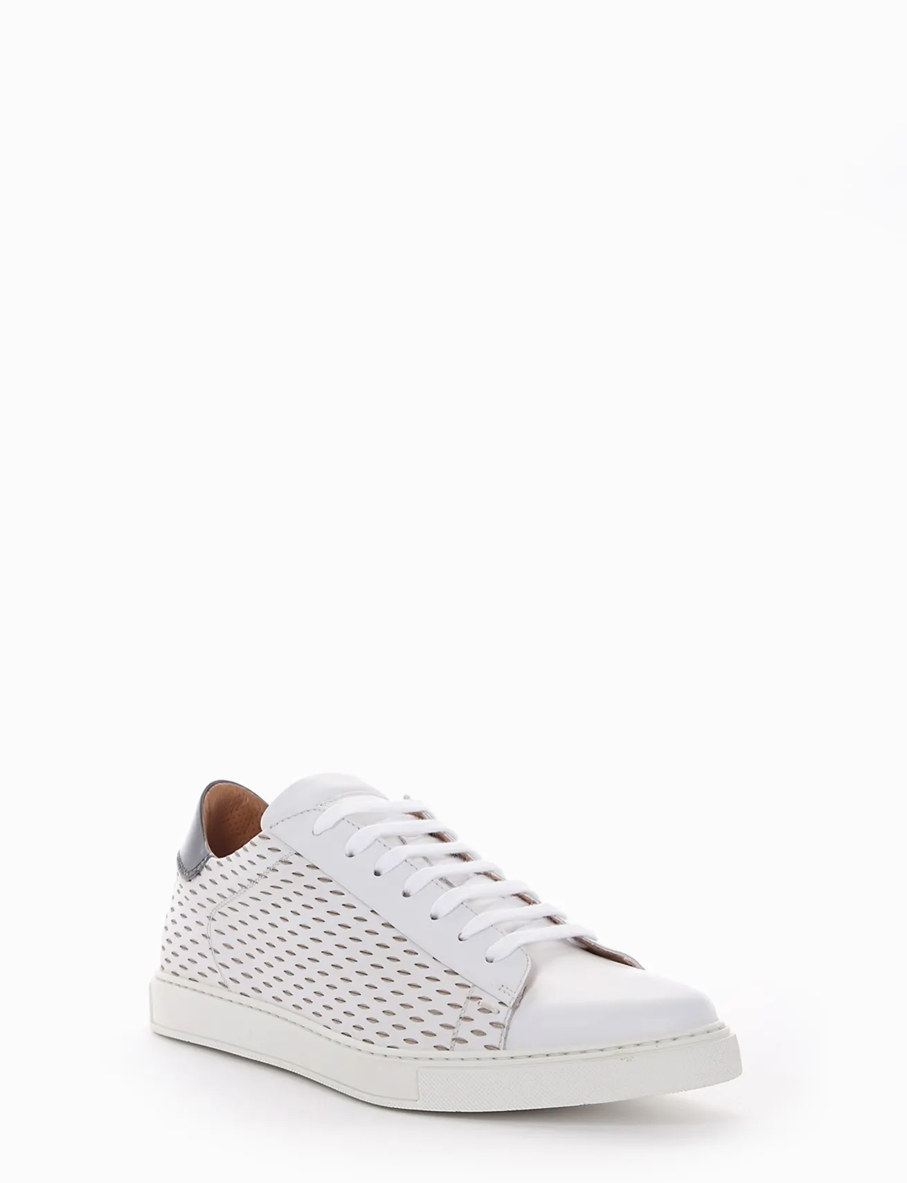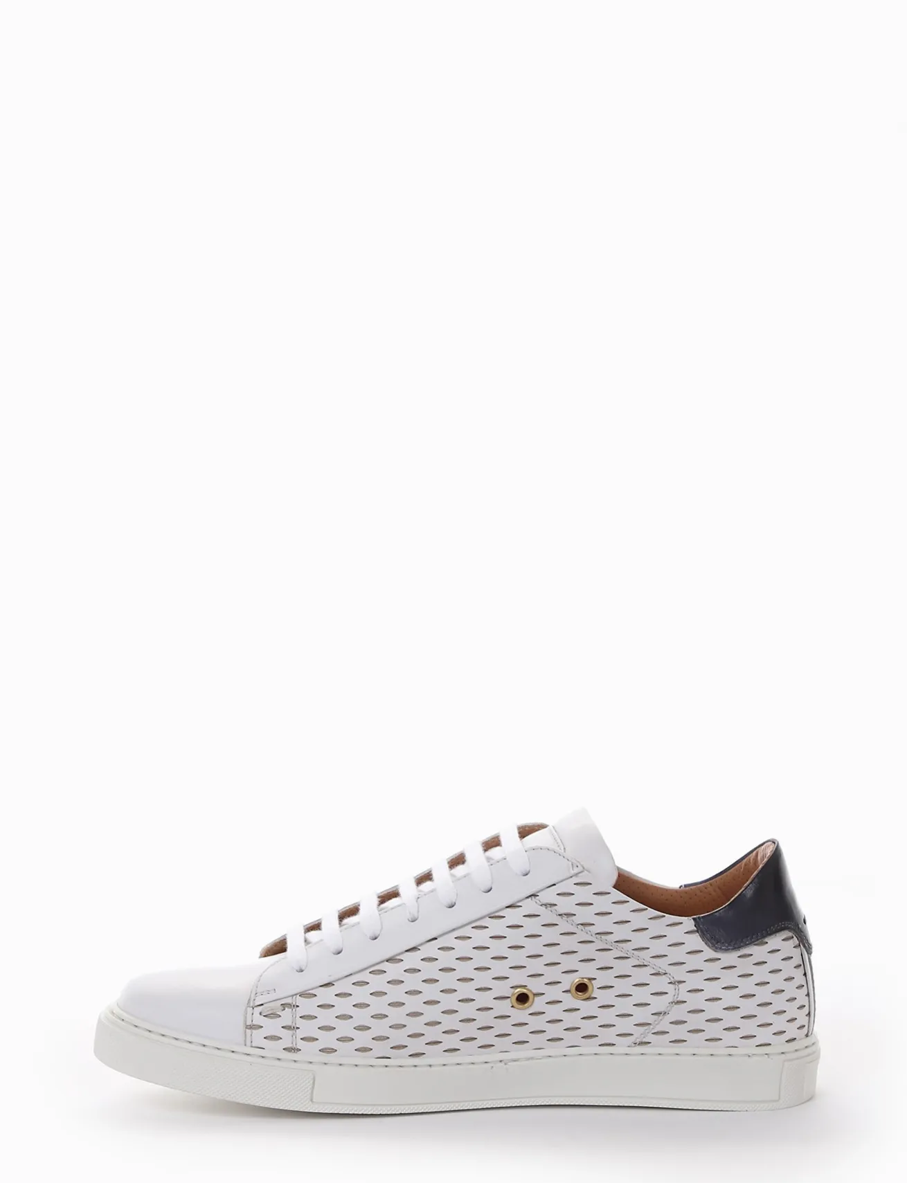 Sneakers fondo gomma e soletto interno in vera pelle. Tomaia in morbida pelle di vitello, laseratura nel parte laterale. Talloncino blu per un look sporty.