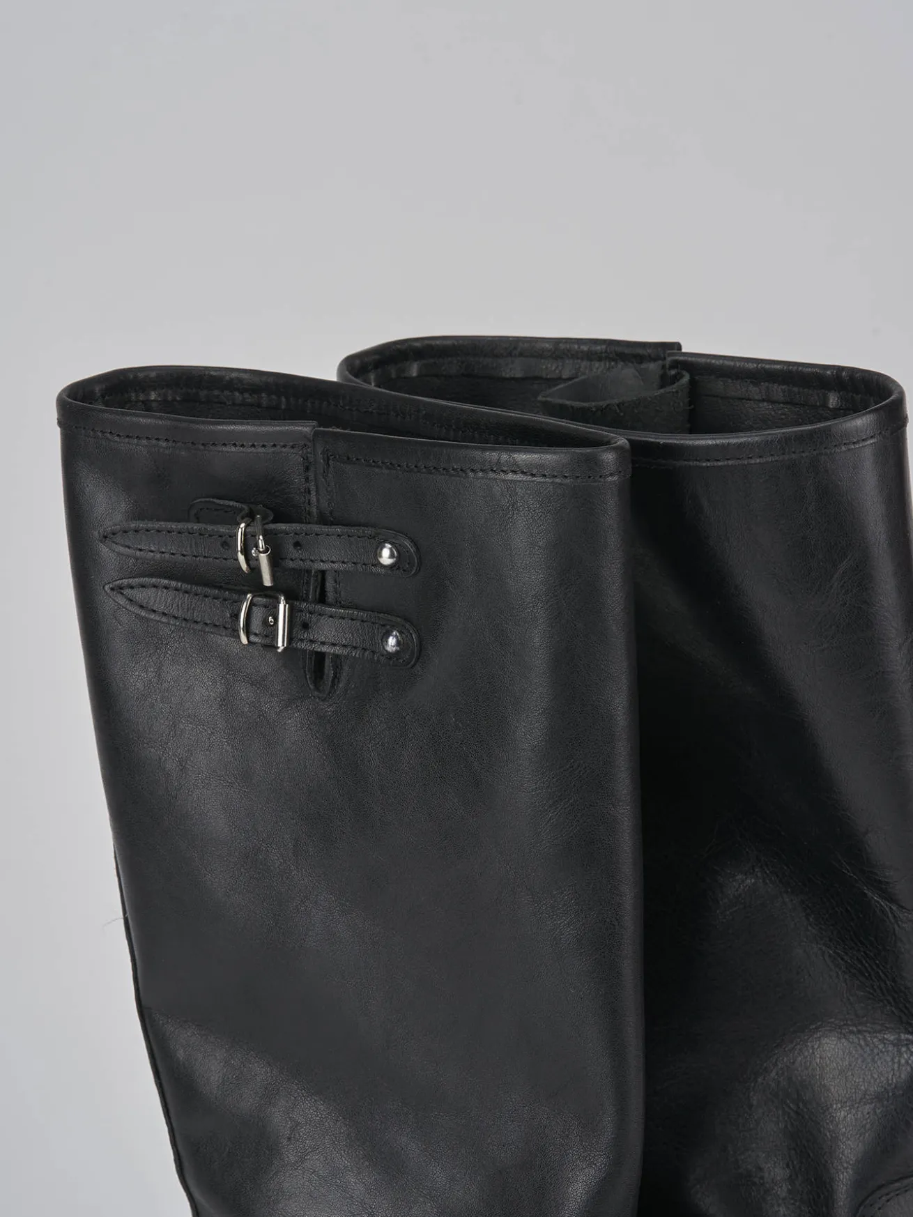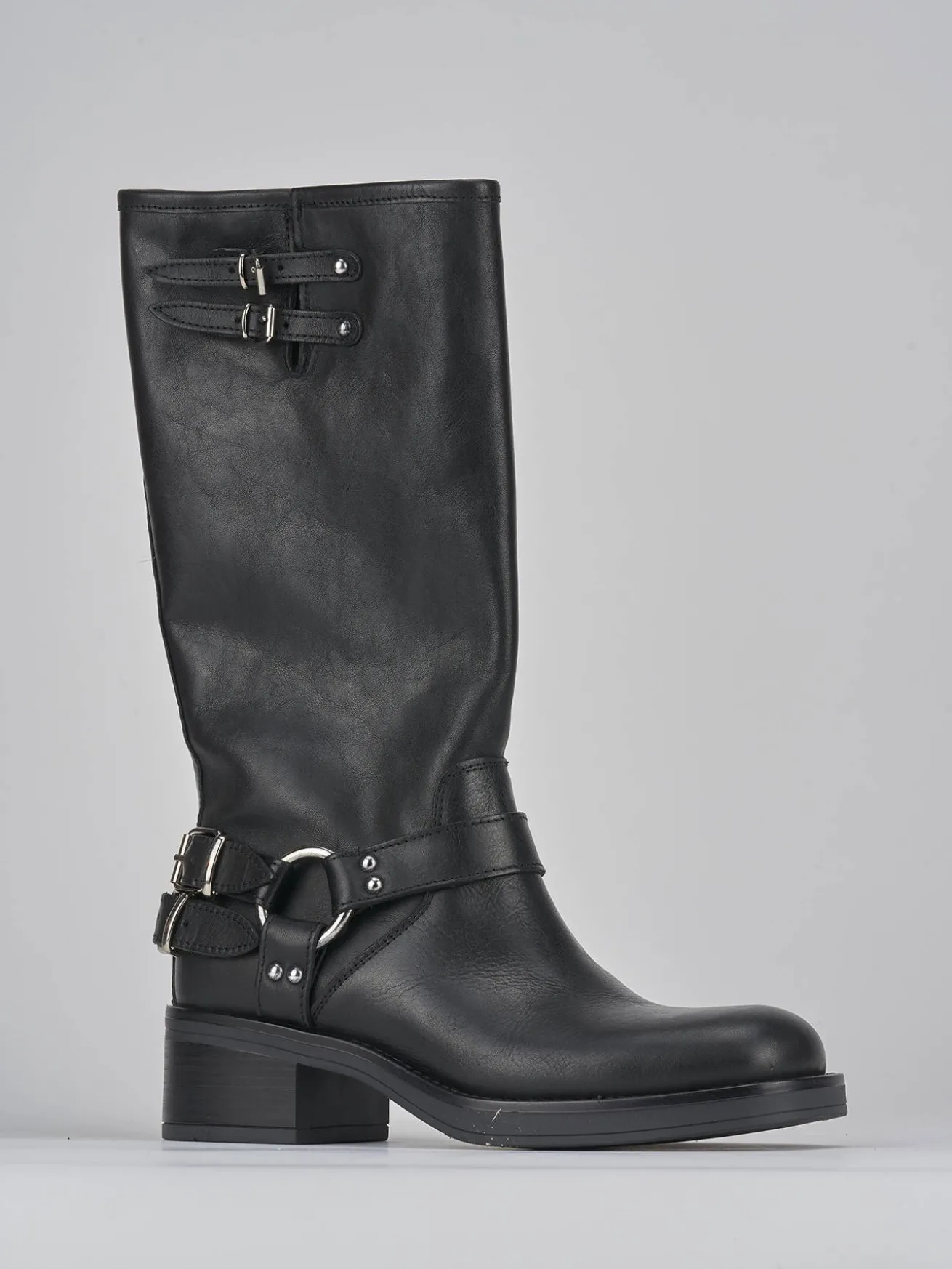 Stivale biker tacco 5 cm, fondo in gomma e soletto interno in vera pelle. Tomaia in morbida pelle nappata, punta tonda, fibbie regoalbili altezza caviglie che in cima al gambale che misura appena sotto il ginocchio. accessori in metallo e tacco grosso per un look biker cool.