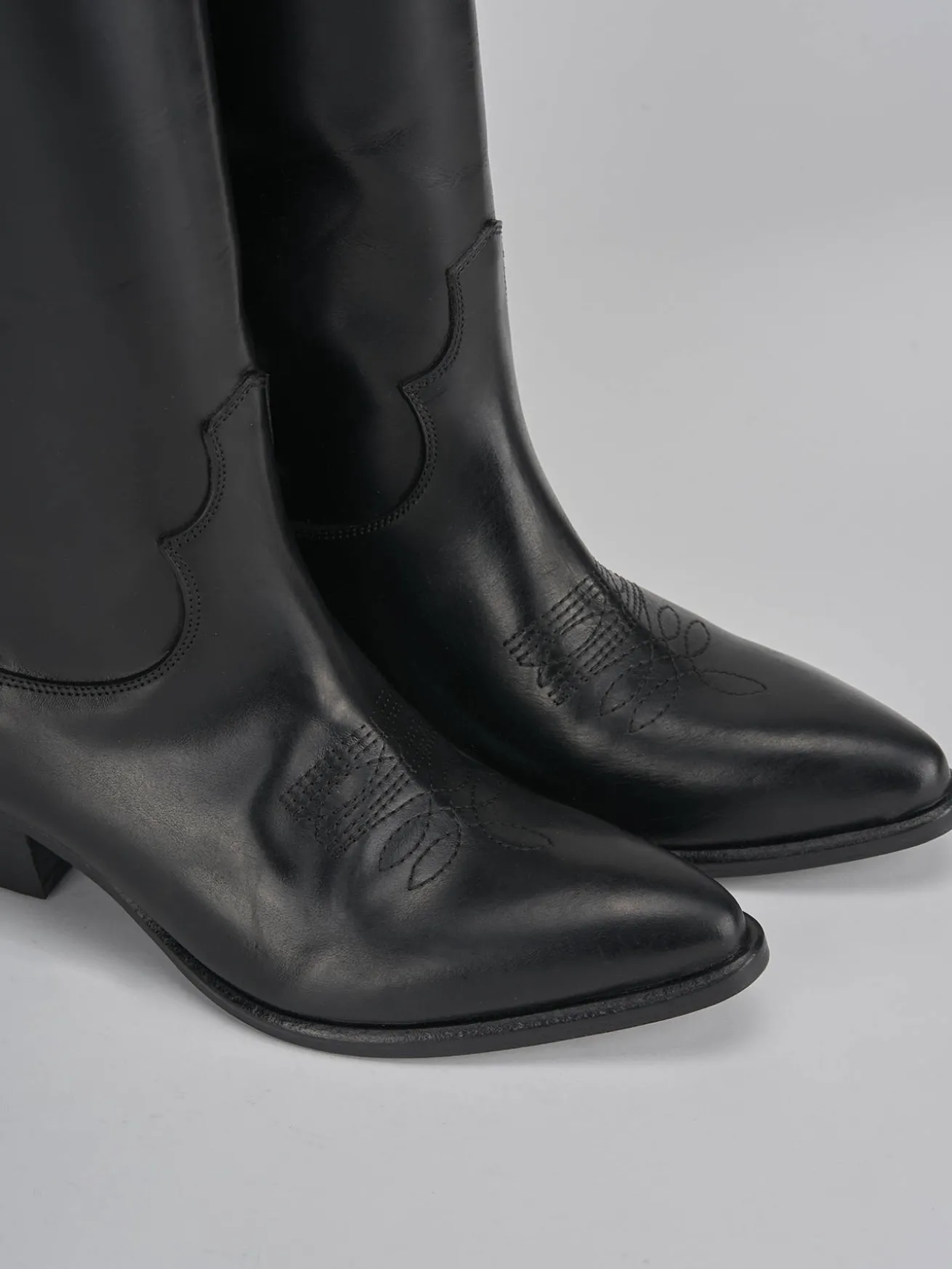 Stivale tacco 5 cm, fondo in cuoio e soletto interno in vera pelle. Tomaia in pelle di ottima qualità, punta sfilata, ghette, cuciture visibili sulla punta e lungo il gambale che misura appena sotto il ginocchio. perfetto per i tuoi look cool.