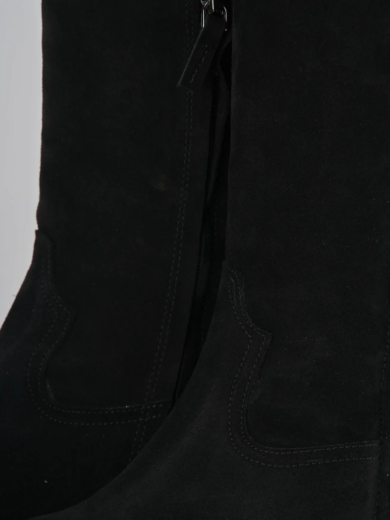 Stivale texano tacco 3,5 cm fondo in gomma e soletto interno in vera pelle. Tomaia in morbido camoscio, punta affusolata, comoda cerniera laterale, ghette, cuciture ben visibili e lungo gambale tubolare che misura appena sopra il ginocchio per un look texano cool.