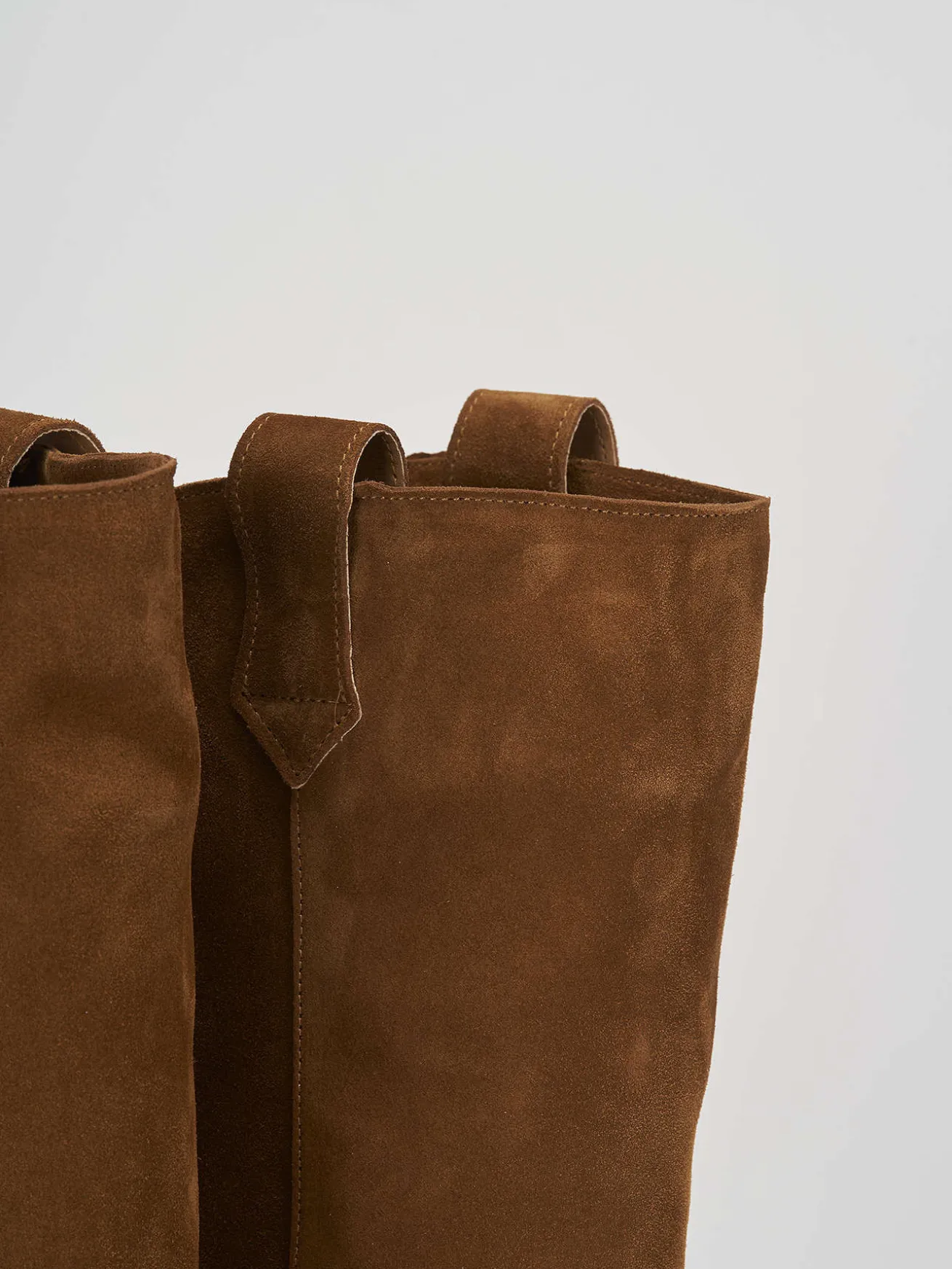stivale texano tacco 4 cm, fondo gomma e soletto interno in vera pelle. tomaia in morbida pelle scamosciata, texano, ghette per un look cool. Altezza gambale fino a sotto il ginocchio.