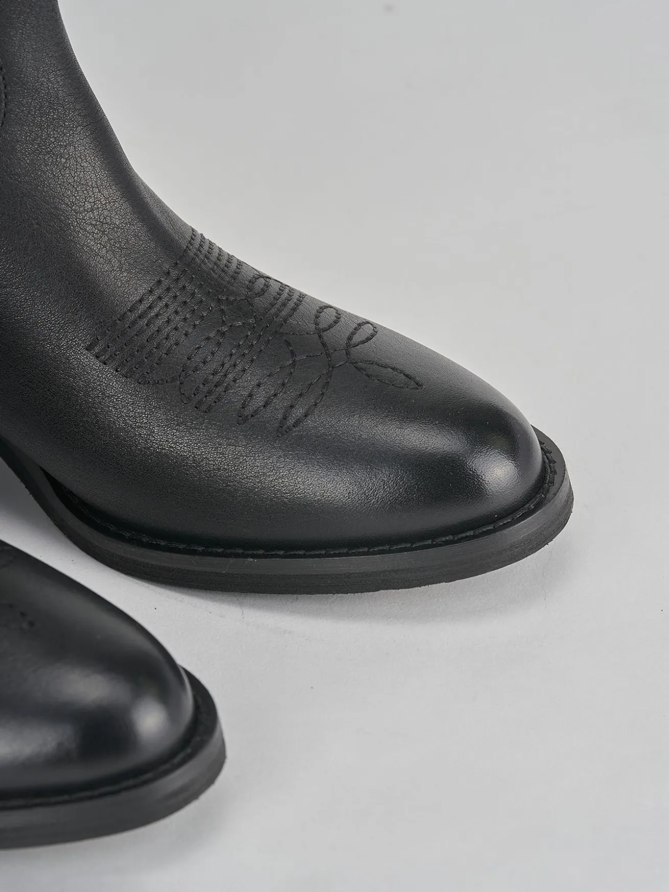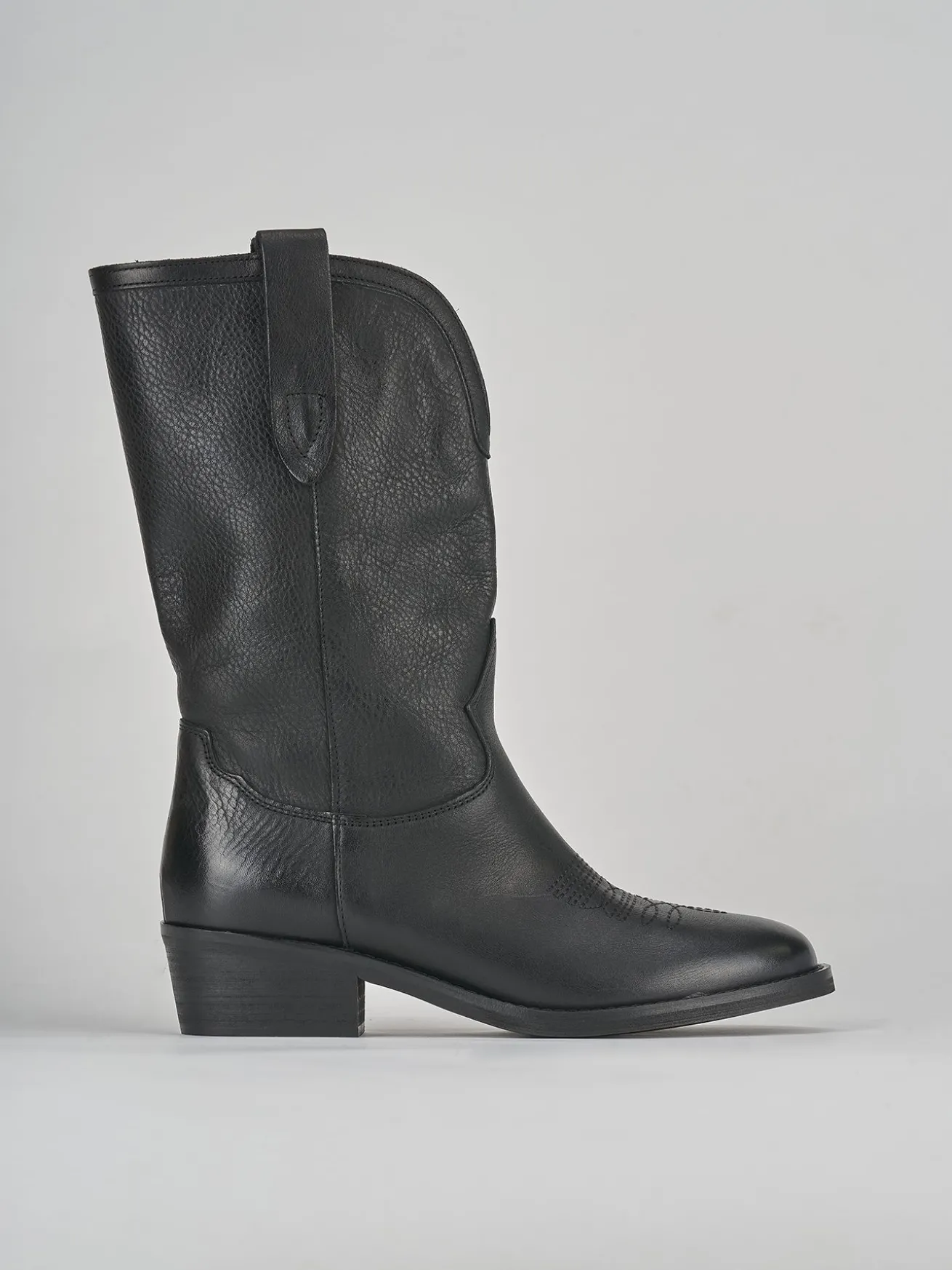 stivale texano tacco 4 cm, fondo in leggera gomma e soletto in vera pelle. tomaia in morbido vitello, punta tonda, ricami e altezza gambale a metà polpaccio con particolare svasatura anteriore per slanciare la tua figura.
