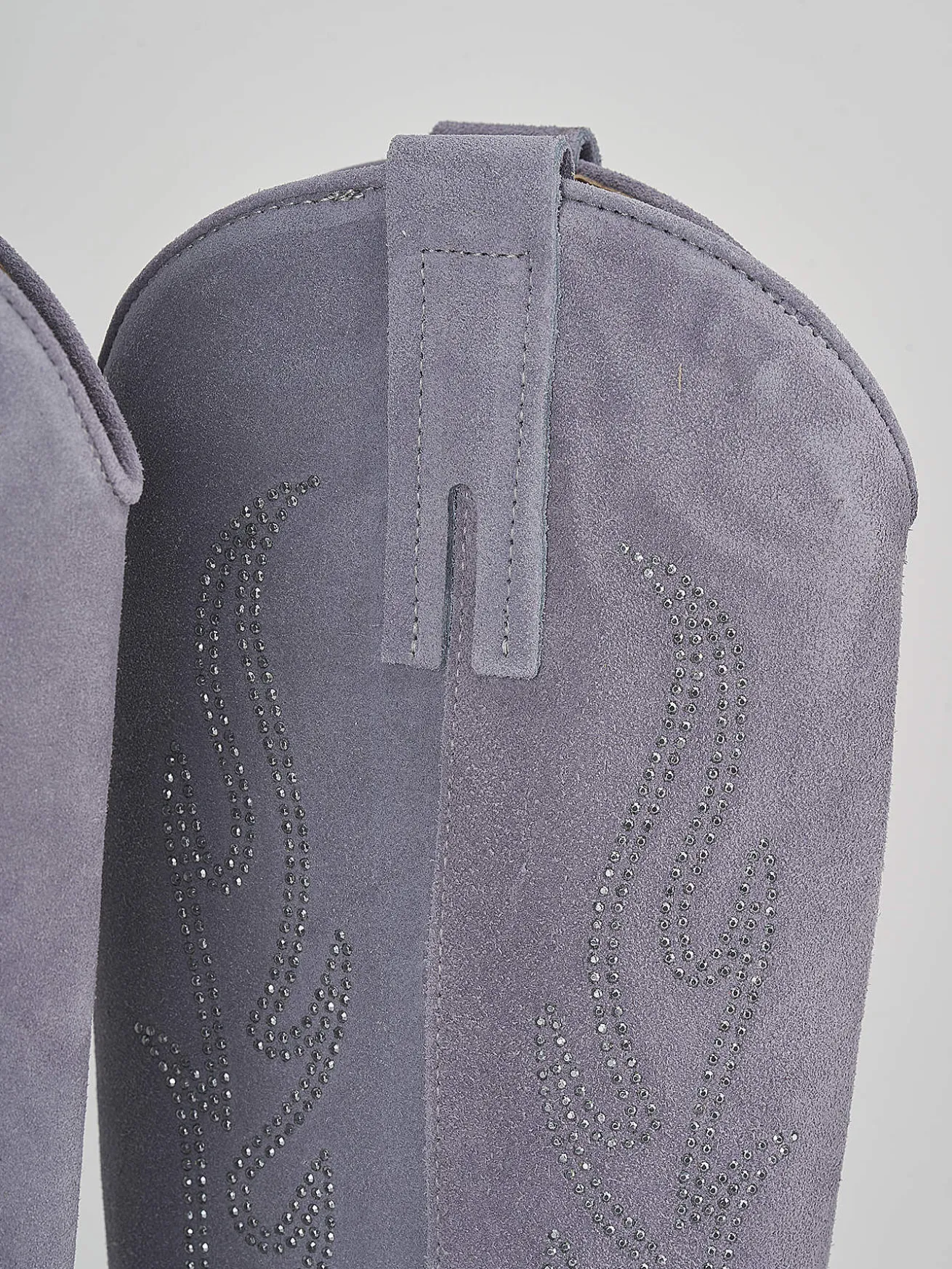 Stivale texano tacco 7 cm, fondo in cuoio e soletto interno in vera pelle.Tomaia in morbida nappa scamosciaata, punta sfilata, strass laterali, adatto con dei jeans o un vestito per un look super cool.Altezza gambale 5cm sotto al ginocchio con leggera svasatura a v nella parte anteriore.