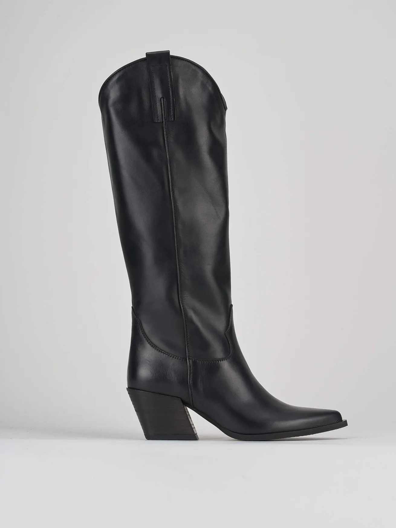 Stivale texano tacco 7 cm, fondo in leggerissima gomma e soletto interno in vera pelle.Tomaia in morbida pelle, punta sfilata, cuciture sulla parte bassa, giusto con una gonna o un vestito per un look tex-cool. Altezza gambale fino a sotto il ginocchio svasato davanti per slanciare la tua figura.