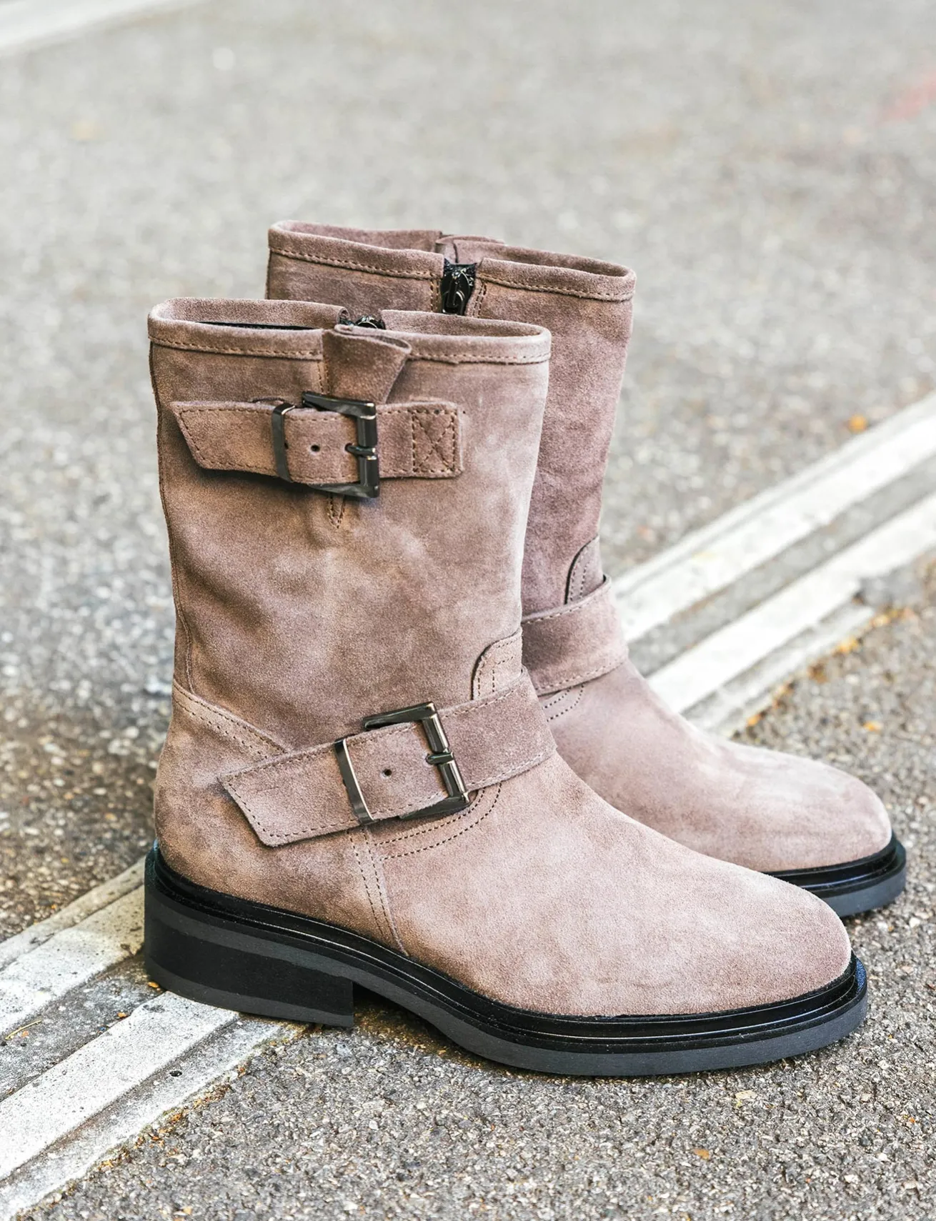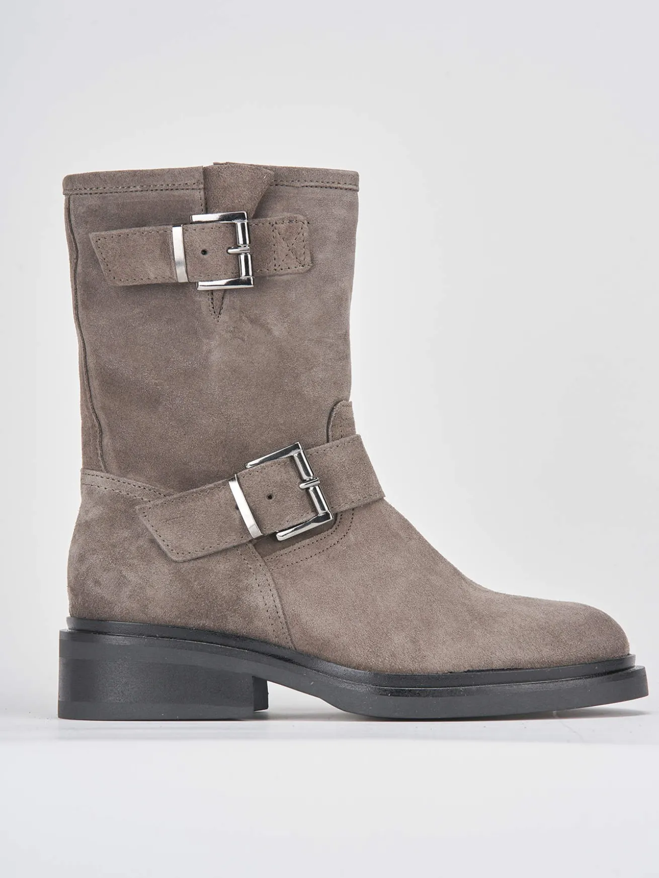 Tronchetto tacco 2 cm fondo in gomma e soletto interno in vera pelle. Tomaia in morbido camoscio, punta tonda, cerniera laterale e doppia fibbia per uno stivaletto perfettamente adatto ai tuoi outfit preferiti.