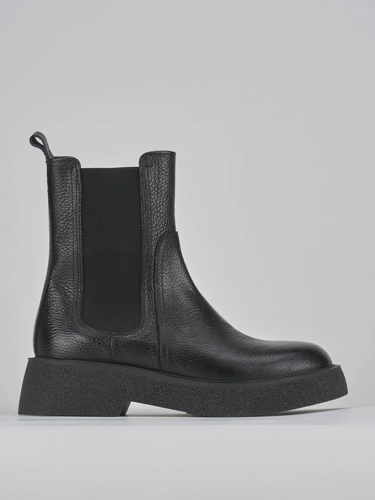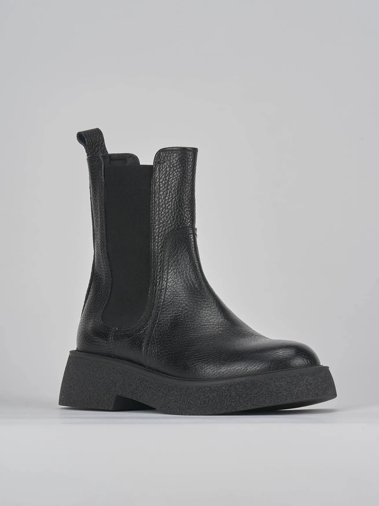 Stivaletto tacco 2 cm fondo in gomma e soletto interno in vera pelle. Tomaia in morbida pelle bottolata, punta arrotondata, tessuto elasticizzato ai lati per un look classico oltre le stagioni. Leggero plateau di 1.5 cm sulla parte anteriore.