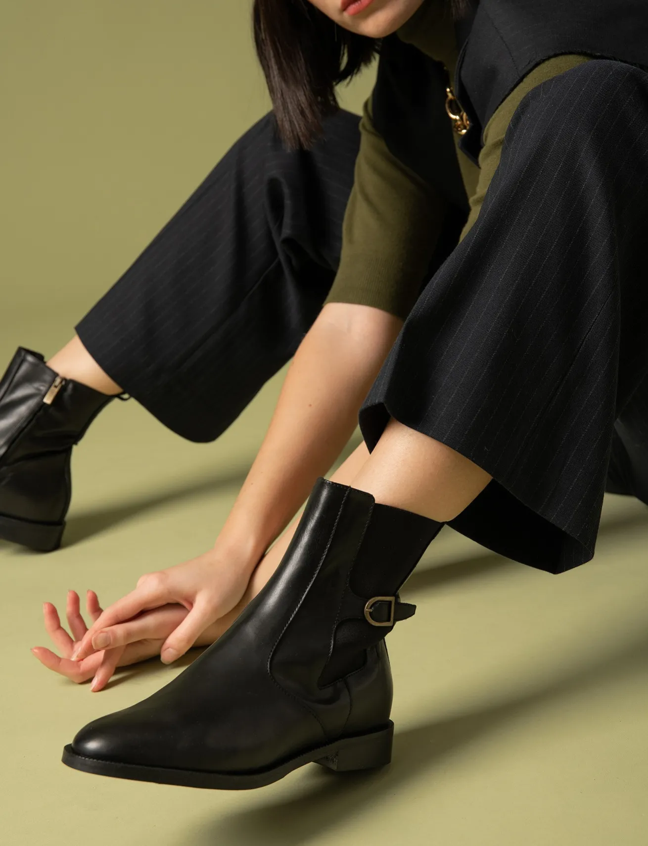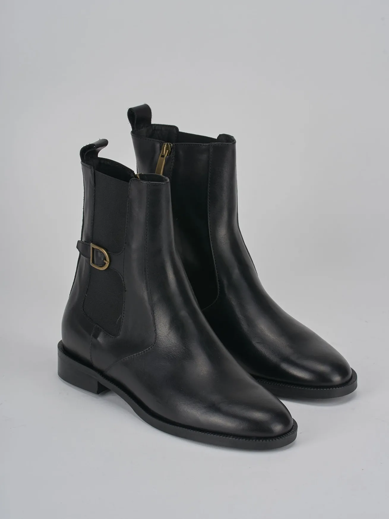 Stivaletto tacco 2 cm fondo in gomma e soletto interno in vera pelle. Tomaia in morbida pelle, punta affusolata, cerniera laterale, tessuto elasticizzato con fibbia per un look cool.