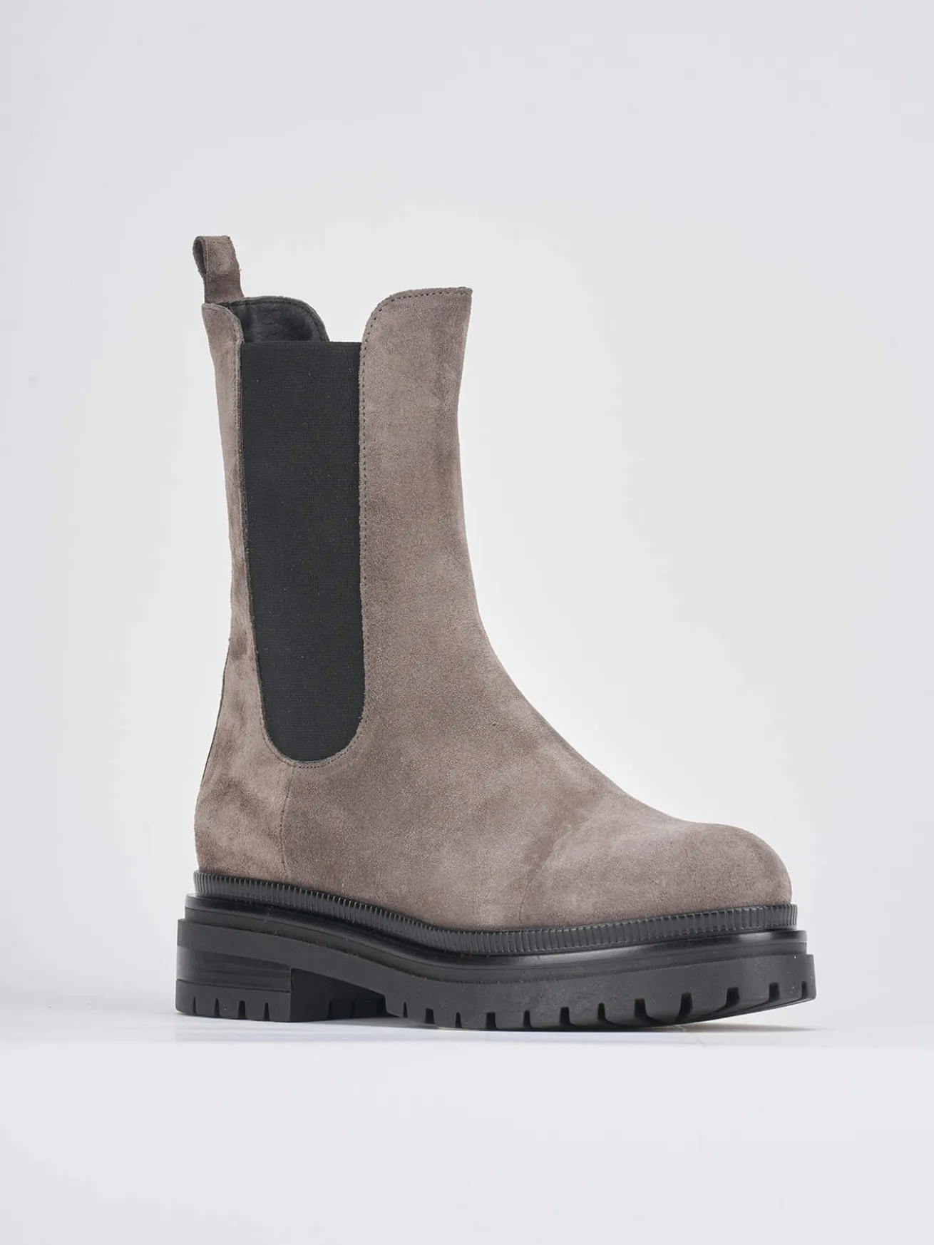 Tronchetto tacco 3 cm fondo in gomma e soletto interno in vera pelle. Tomaia in morbido camoscio, punta tonda e tessuto elasticizzato ai lati per un look cool. comodo anello sul tallone per una calzata facilitata.