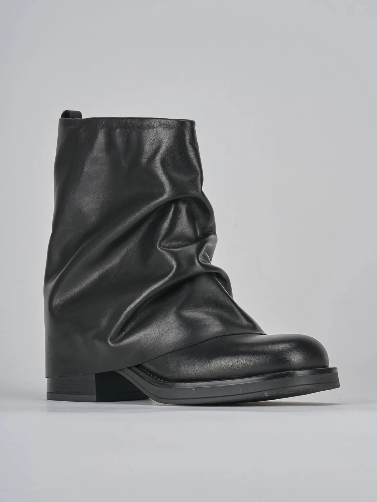 Realizzati in morbida pelle nera, questi stivaletti da donna presentano un moderno design con punta squadrata e un affascinante gambale arricciato.