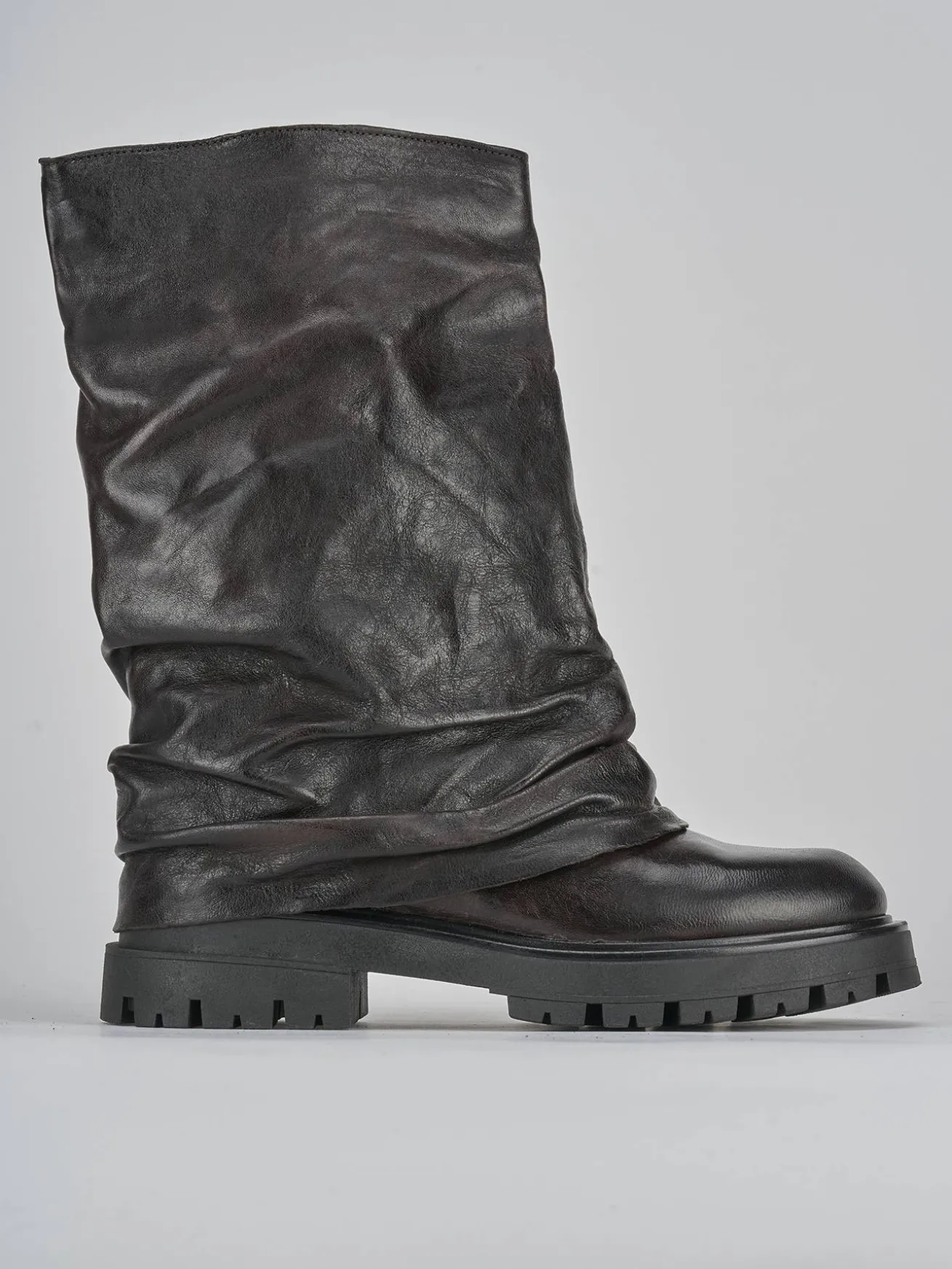 Il gambale arricciato che arriva a metà polpaccio dona un aspetto moderno e dinamico, perfetto per un look biker chic.