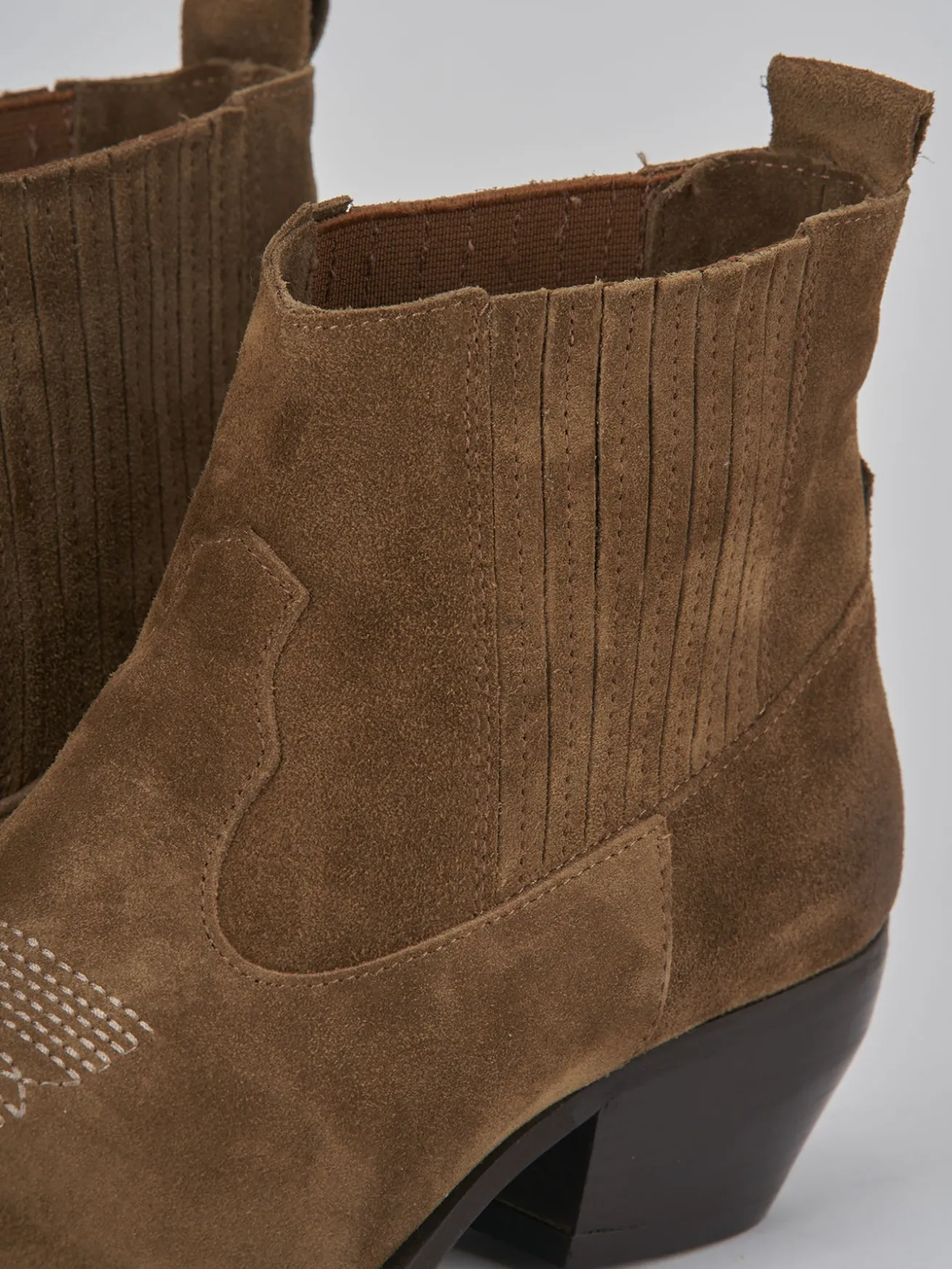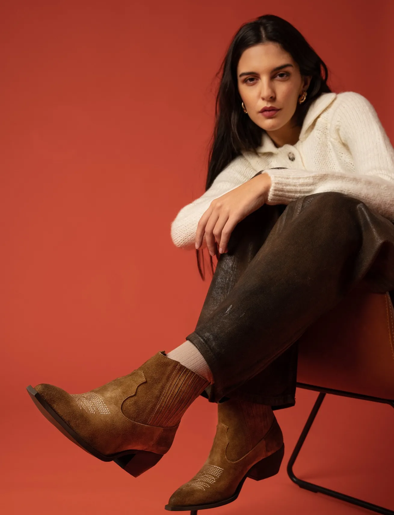 Stivaletto texano tacco 4 cm fondo in gomma e soletto interno in vera pelle. Tomaia in morbido camoscio, punta sfilata, raffinati ricami sul collo del piede, cuciture visibili con fascette verticali all’altezza della caviglia e tacco stile texano per un look cool.