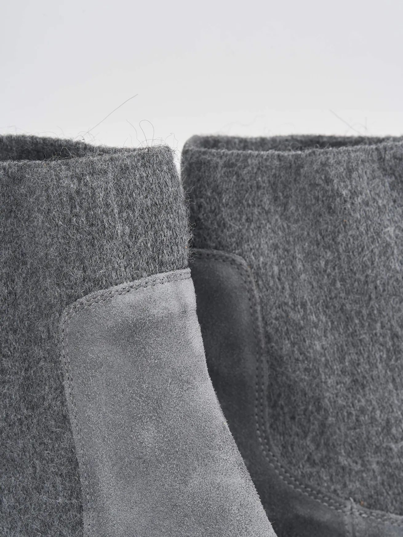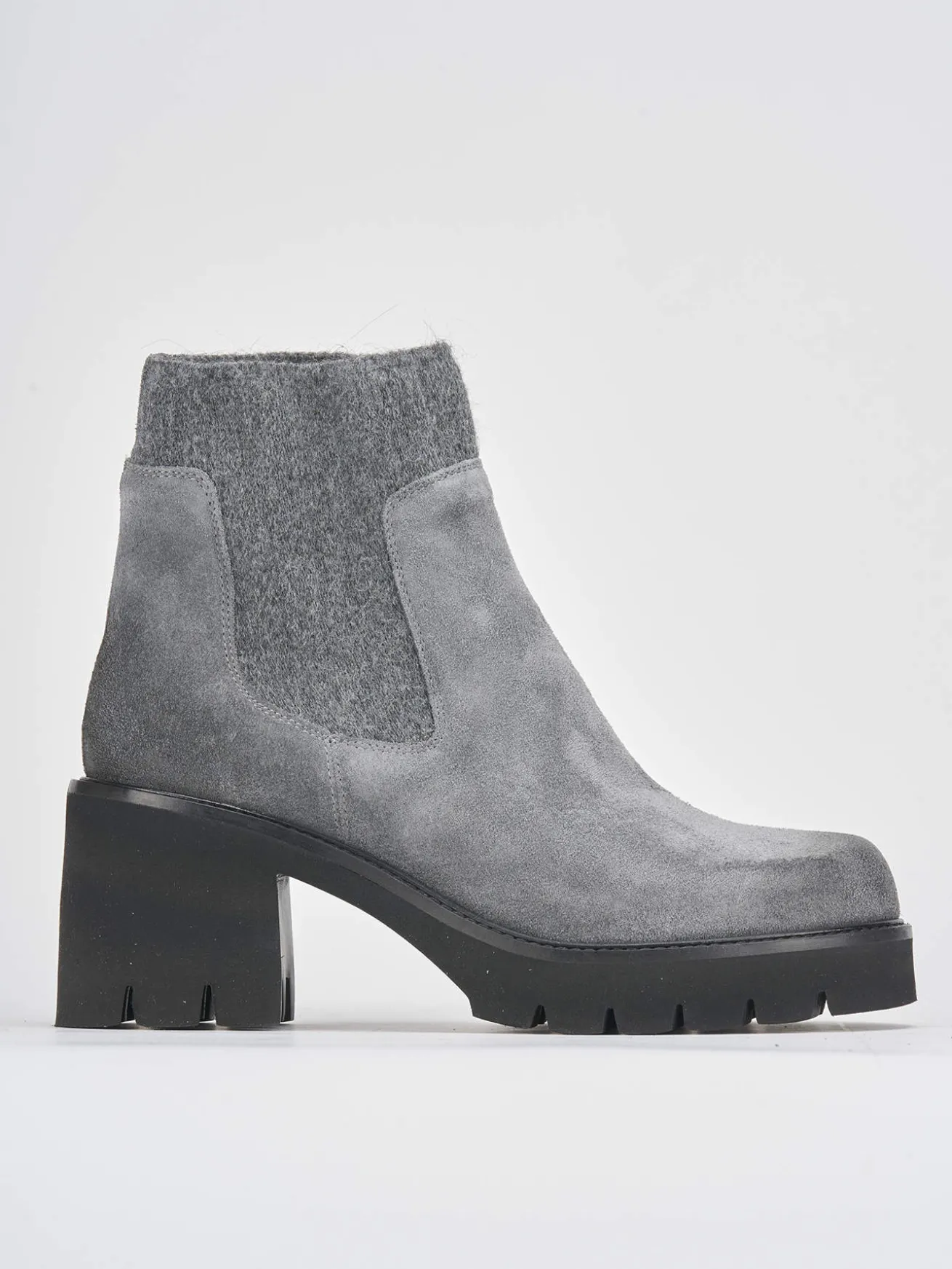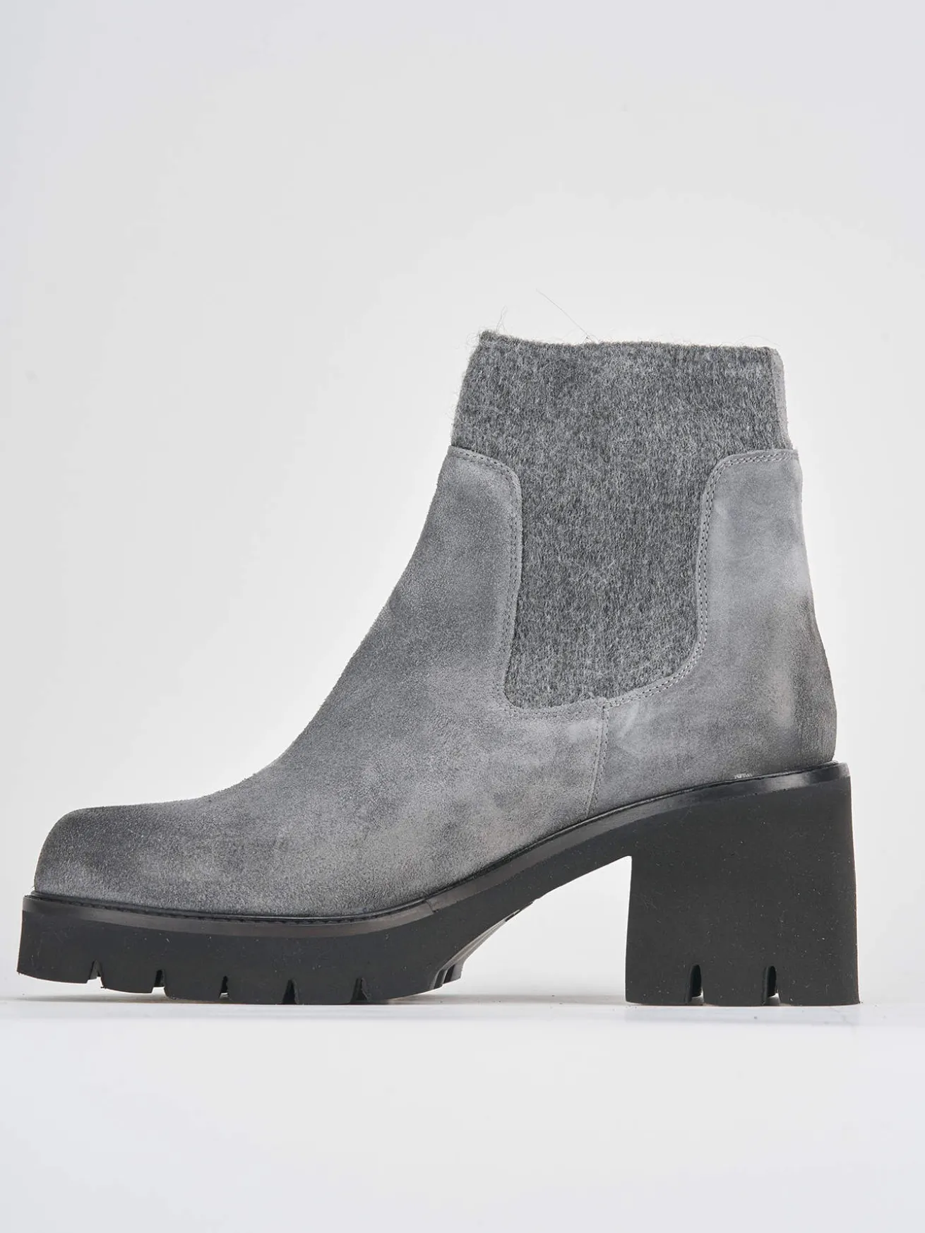 Tronchetto tacco 5 cm fondo in gomma e soletto interno in vera pelle. Tomaia in morbido camoscio, punta tonda, plateau di 1 cm sulla parte anteriore, cuciture visibili e lati elasticizzati con tessuto in lana e tacco grosso in contrasto con la tomaia per un look cool.