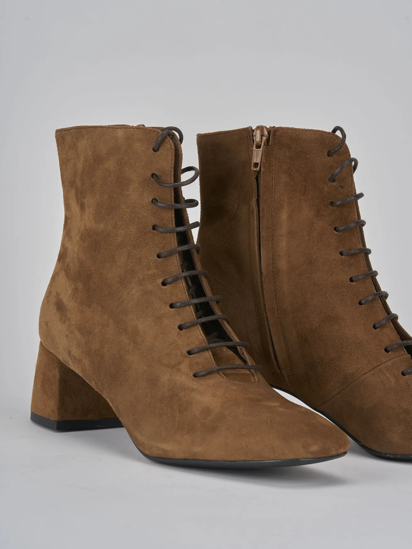 Stivaletto tacco 4.5 cm fondo in gomma e soletto interno in vera pelle. tomaiai in morbido camoscio, punta squadrata, lace, comoda cerniera laterale e tacco grosso per un look chic.