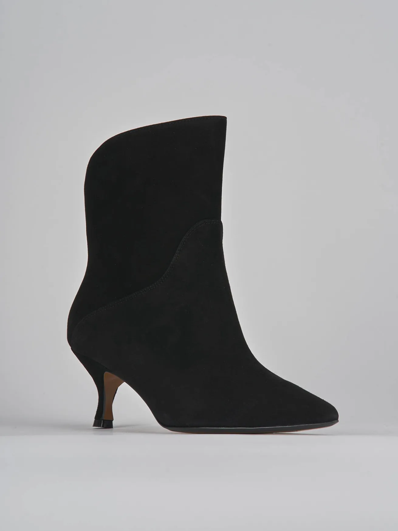 Tronchetto tacco 5 cm fondo in gomma e soletto interno in vera pelle. Tomaia in morbido camoscio, punta sfilata, cuciture visibili, piccola apertura a ‘V’ posteriore e tacco rocchetto. dalla linee eleganti ed elaborate perfetto con qualsiasi tuo look.