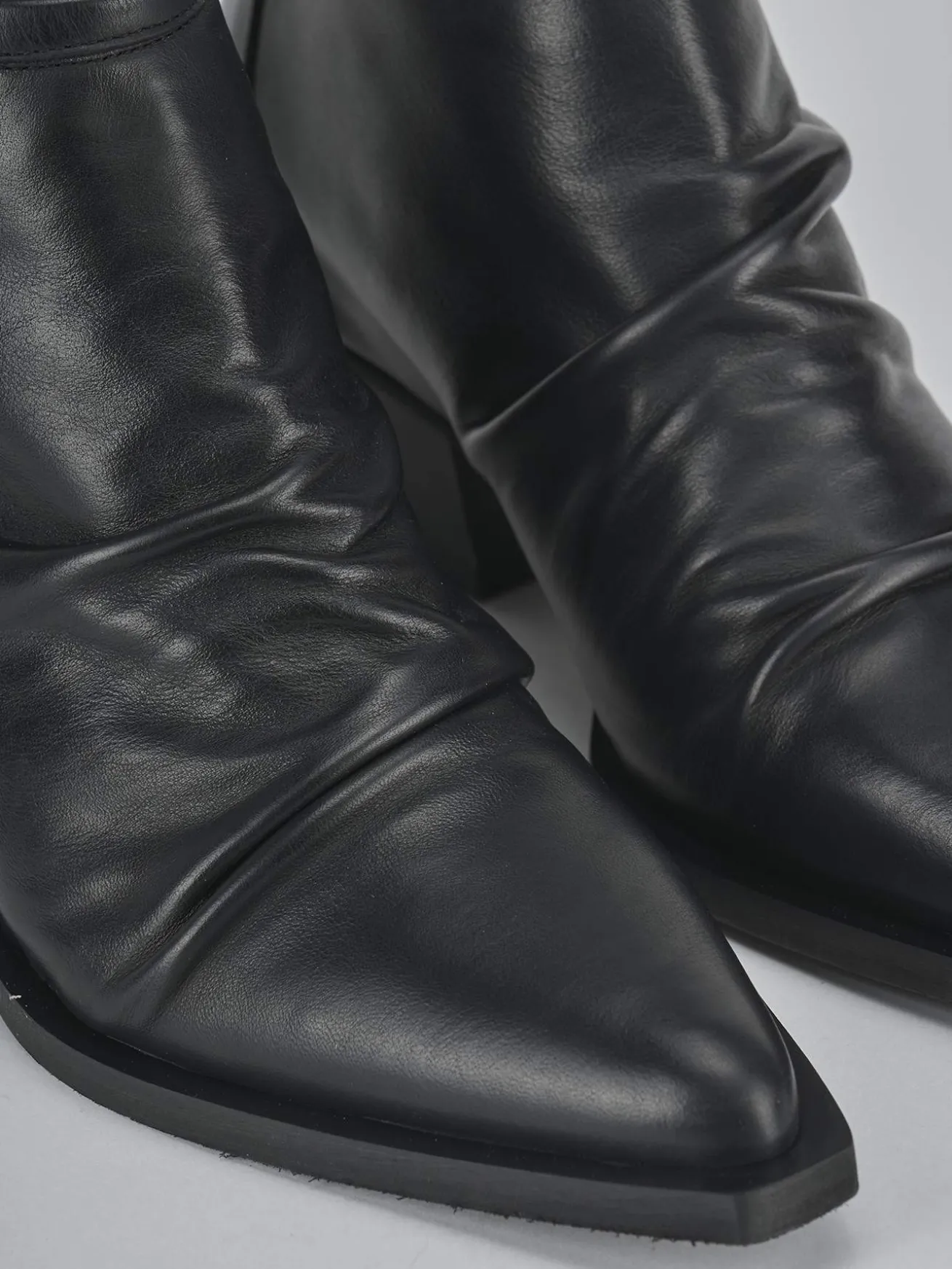 Stivaletto texano tacco 5 cm fondo in gomma e soletto interno in vera pelle. Tomaia in morbida pelle, punta sfilata, cuciture a mano, arricciata sul davanti, comoda cerniera posteriore e tacco stabile. Perfetto con un paio di jeans e una maglia.
