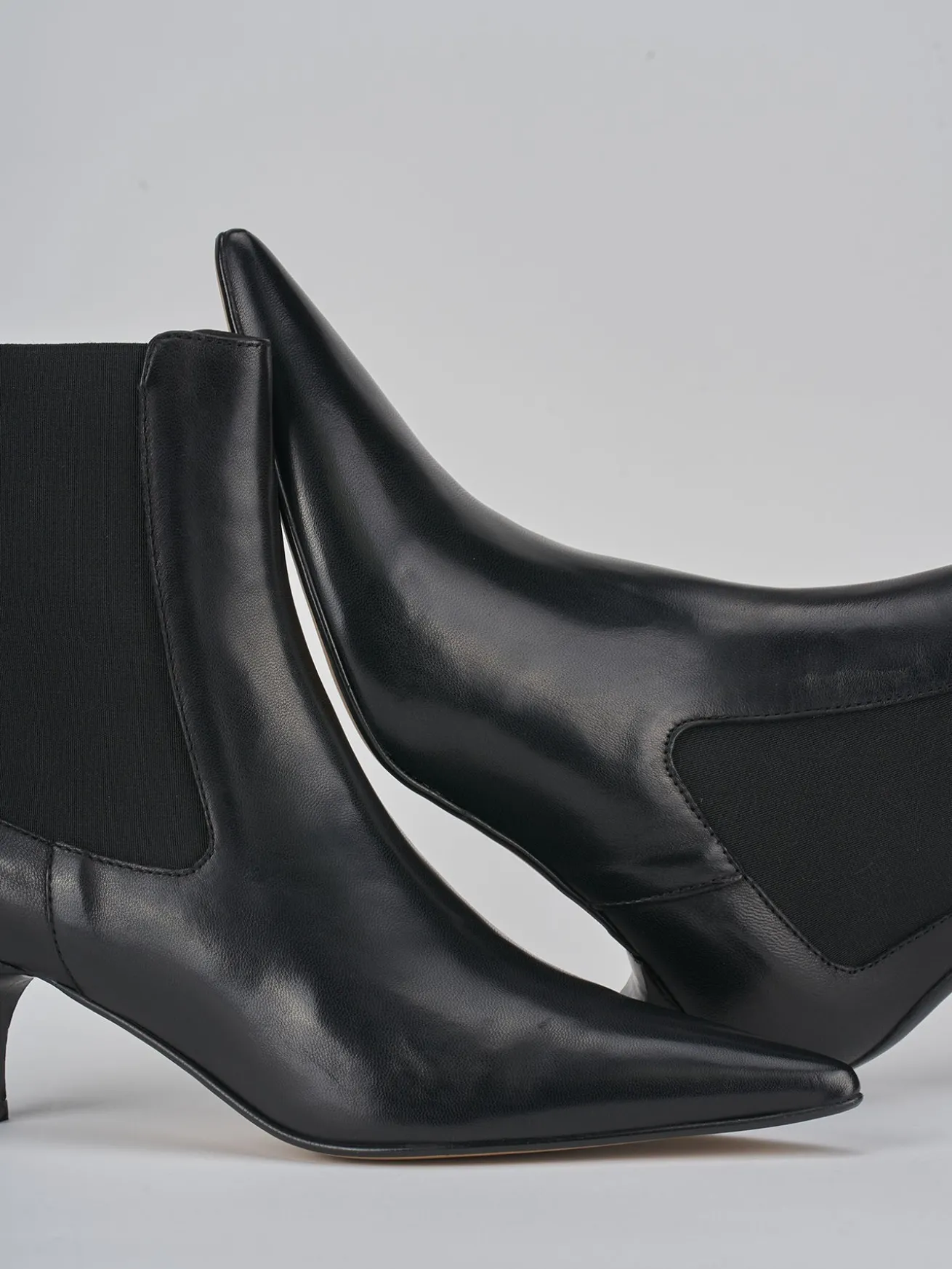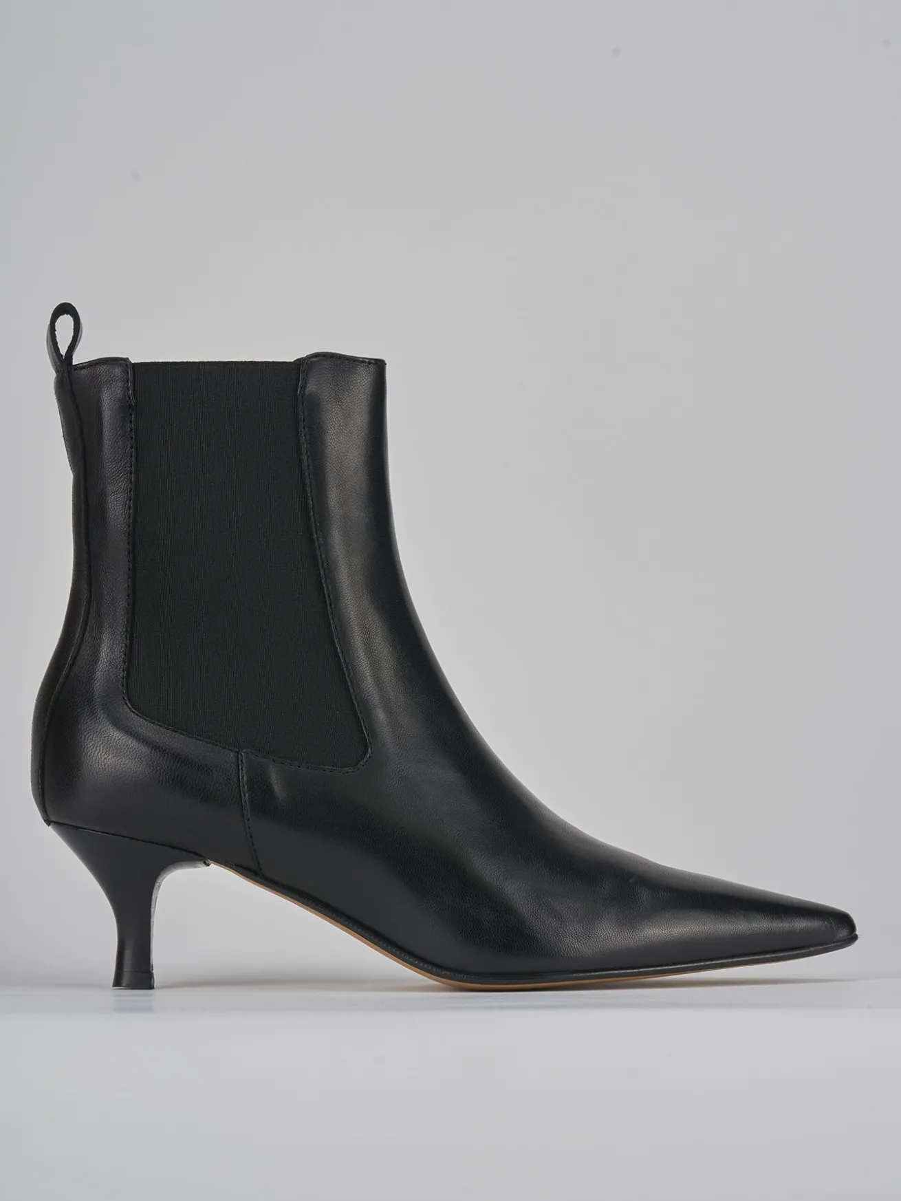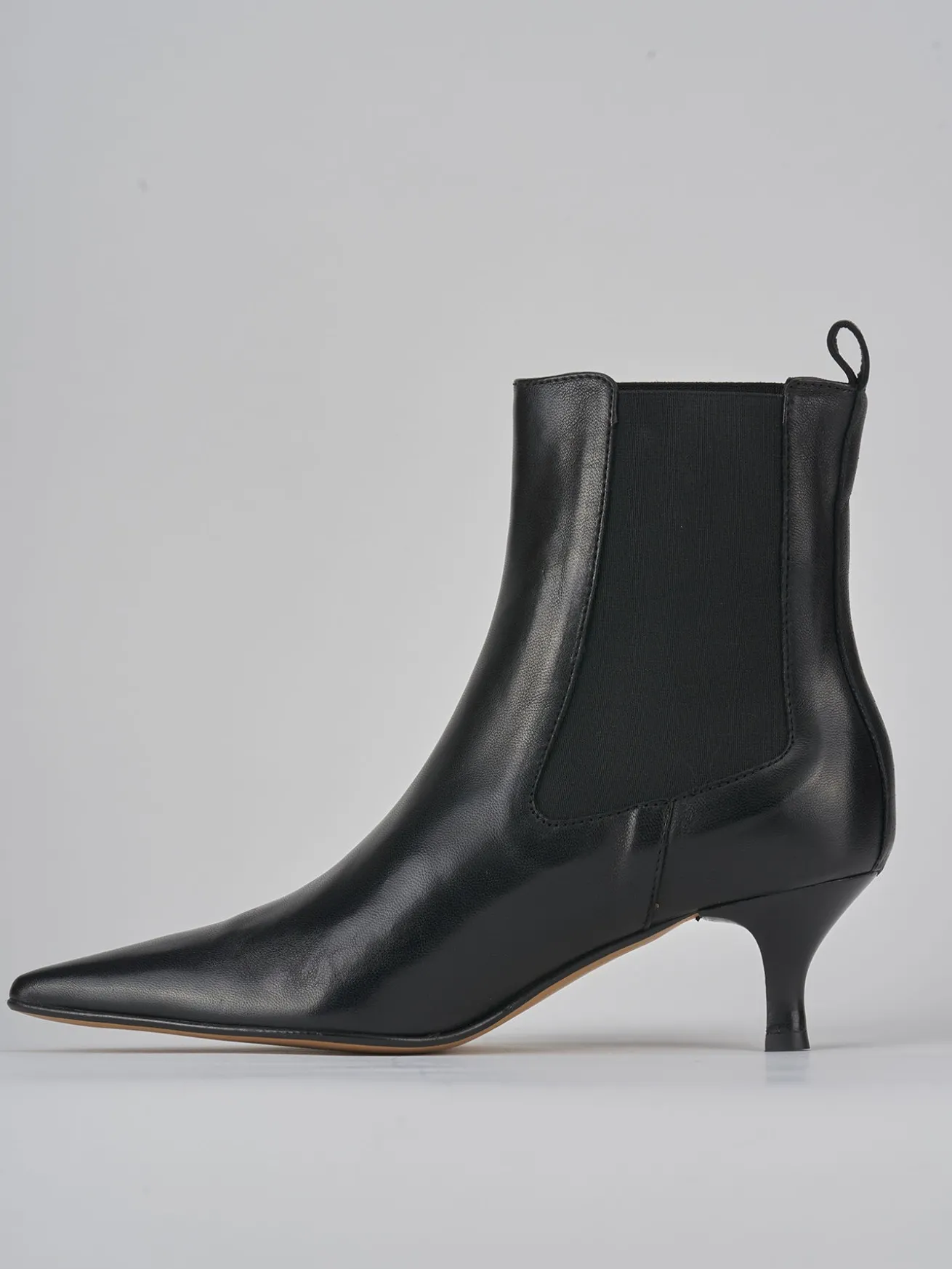 Stivaletto tacco 5 cm fondo in gomma e soletto interno in vera pelle. Tomaia in morbida pelle, punta sfilata, tessuto elasticizzato ai lati e tacco rocchetto per un look chic e raffinato.