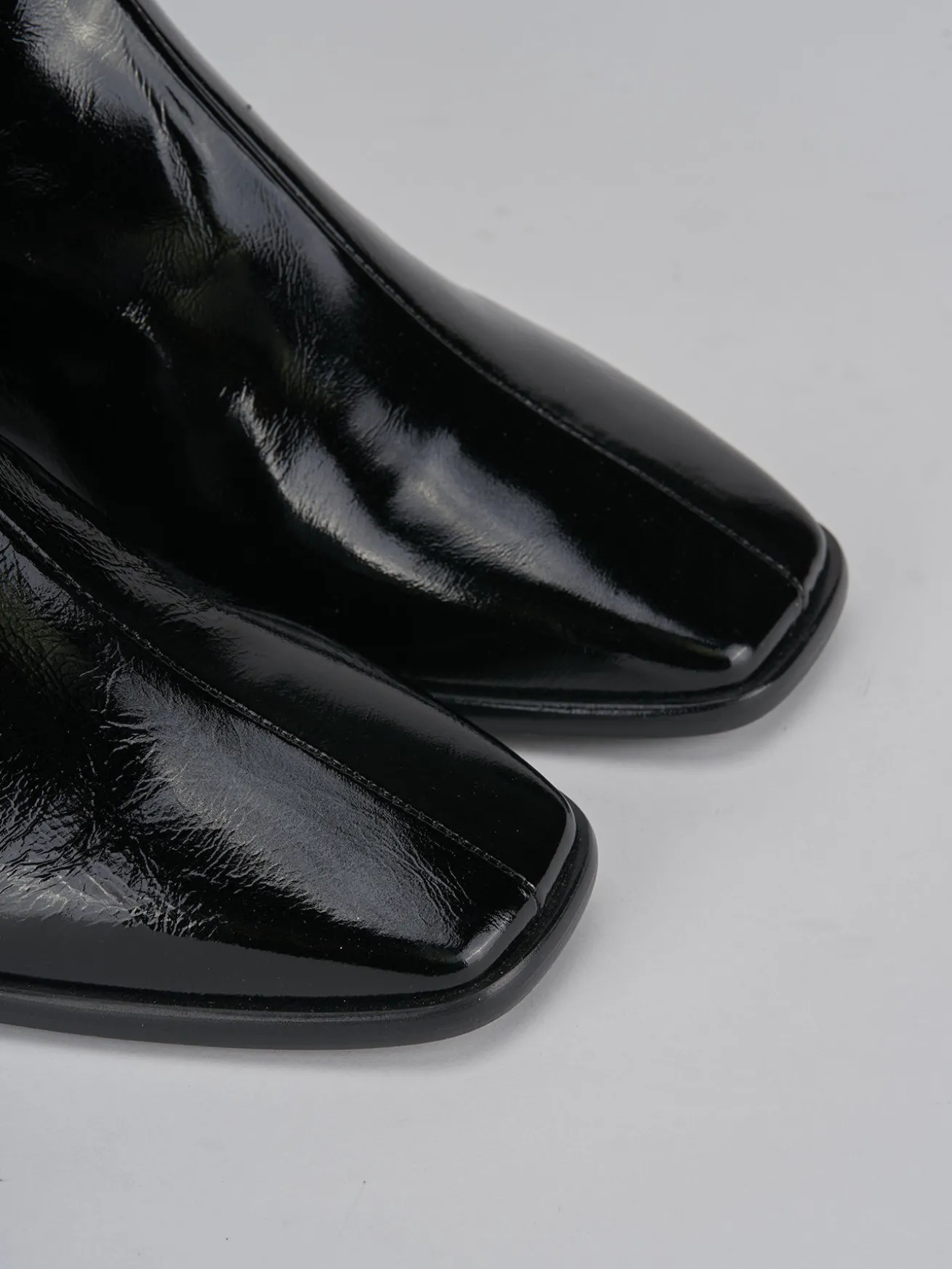 Stivaletto tacco 3 cm fondo in gomma e soletto interno in vera pelle. tomaia in morbida pelle effetto verniciato, punta leggermente squadrata, cerniera laterale, guardolo sporgente e nuovissimo tacco comodo. perfetto con un pantalone a palazzo o una gonna.