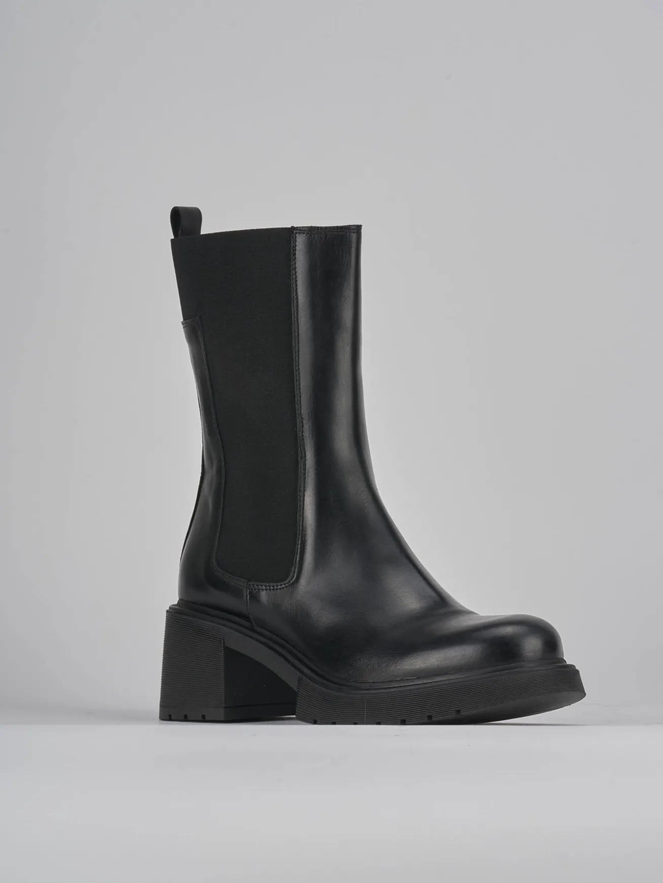 Tronchetto tacco 5 cm fondo in gomma e soletto interno in vera pelle. Tomaia in morbida pelle, punta arrotondata, elastico laterale e anche leggermente dietro e tacco grosso per una camminata facilitata.