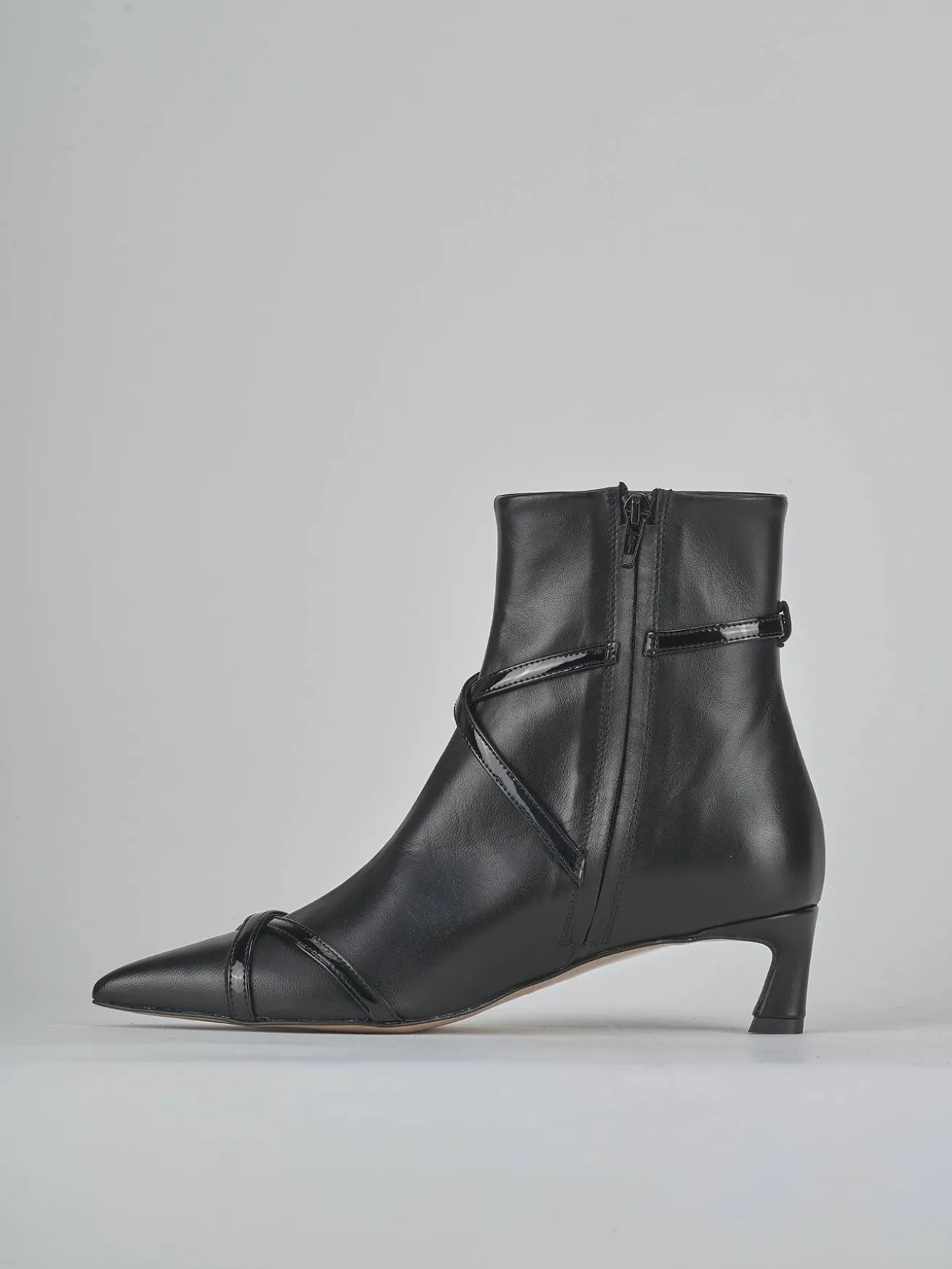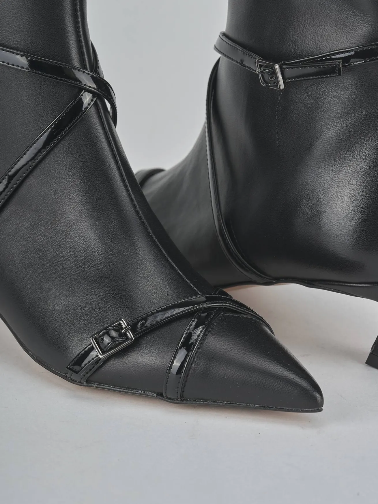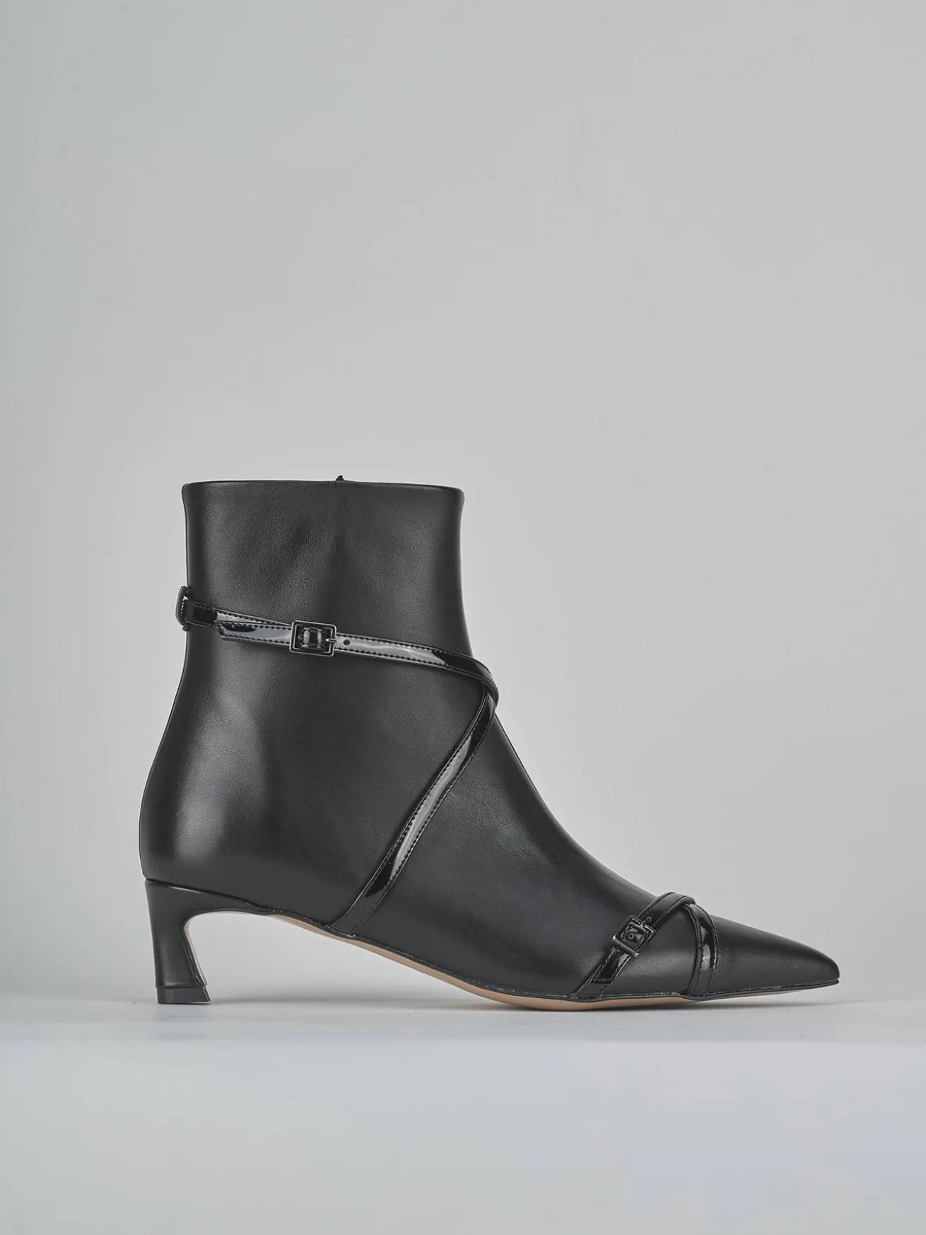 Due cinturini in pelle effetto verniciato, incrociati con fibbia regolabile, aggiungono un tocco di modernità e stile.