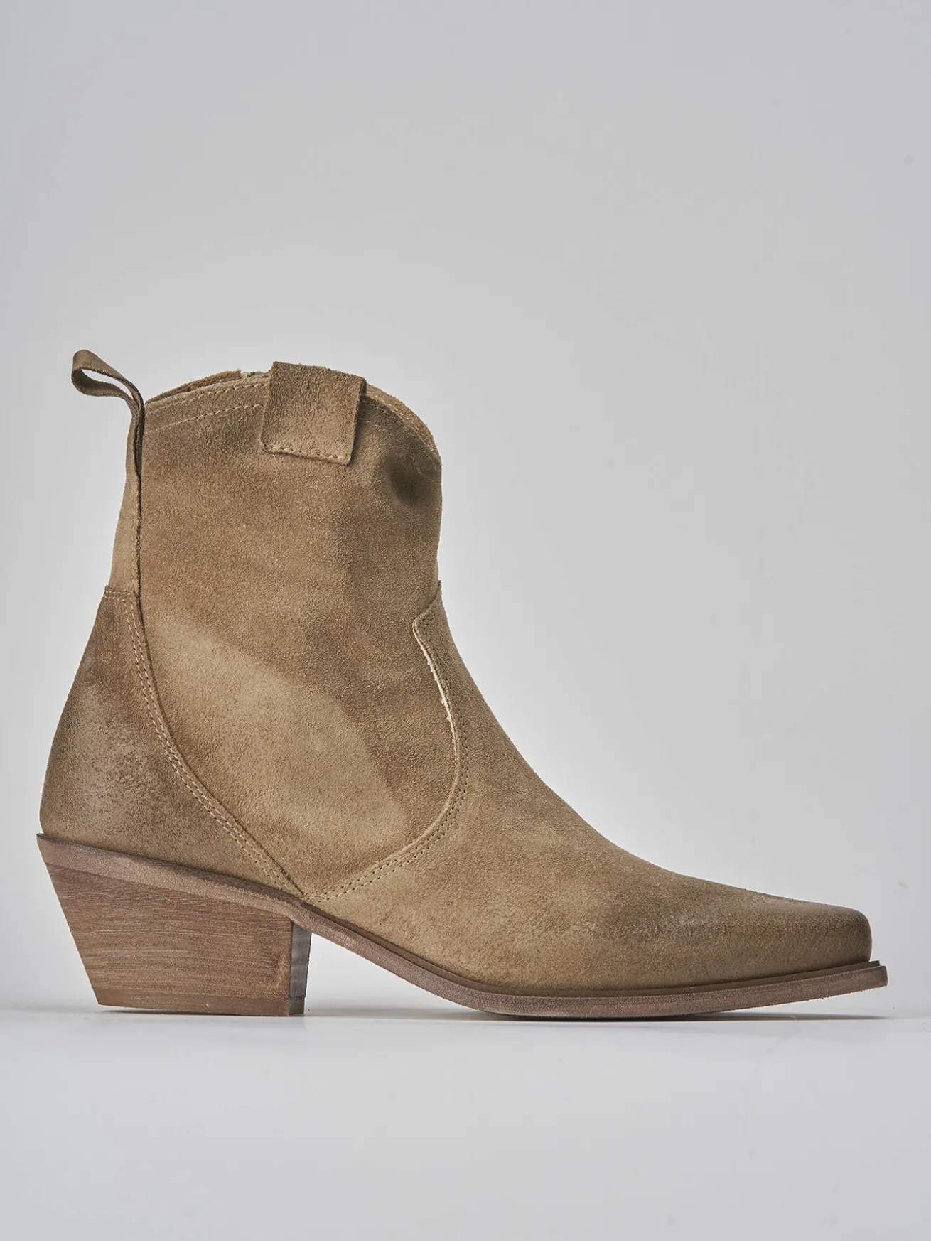 Stivaletto texano tacco 6 cm fondo in leggera gomma e soletto interno in vera pelle. tomaia in morbido camoscio, punta sfilata, cuciture in rilievo, ghette e tacco cabano. Particolare guardolo sporgente per un look tex perfetto.