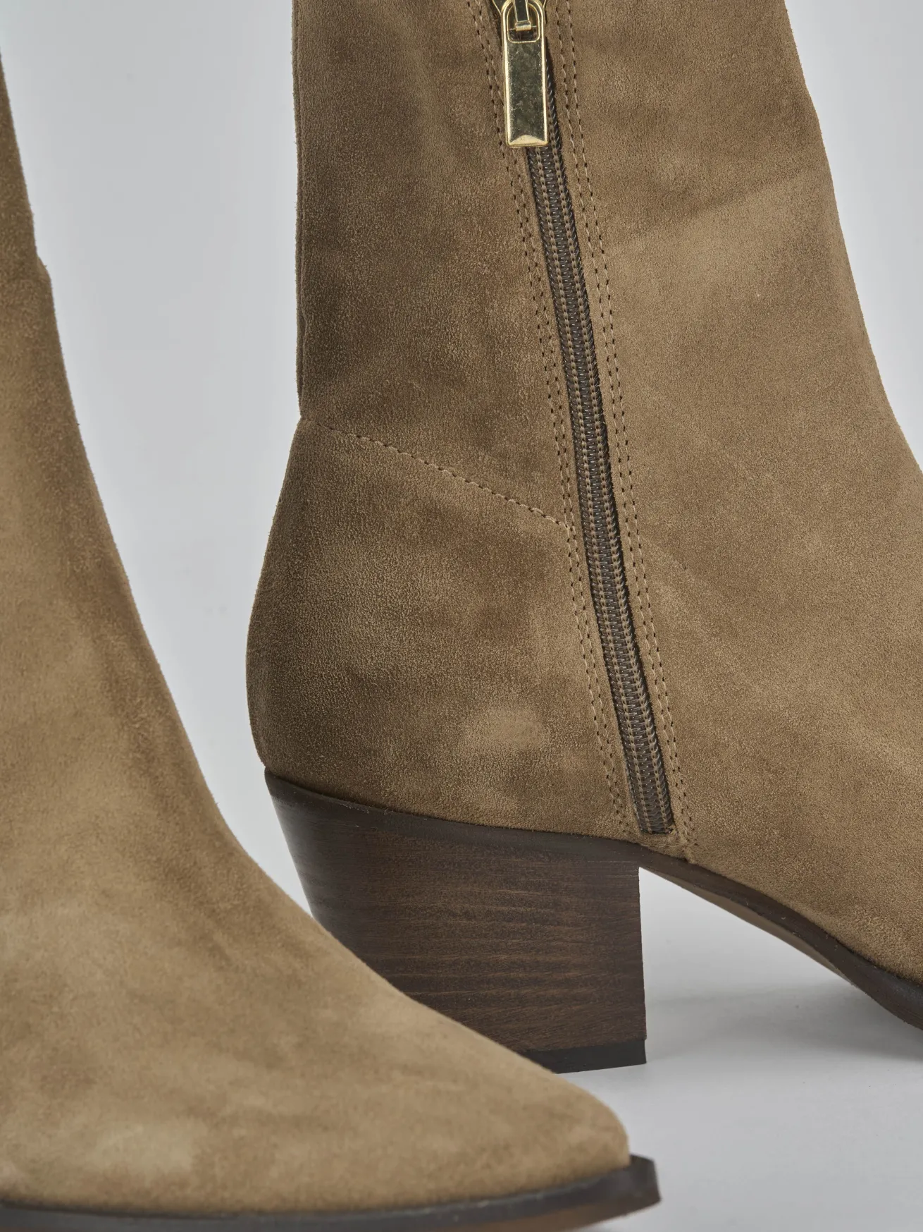 Stivaletto texano tacco 6 cm fondo in gomma e soletto interno in vera pelle. Tomaia in morbida pelle scamosciata, punta sfilata, cuciture a mano, taglio morbido a vivo del gambale che arriva appena sopra la caviglia. Puntale in metallo, comoda cerniera laterale e tacco cubano per un look cool.