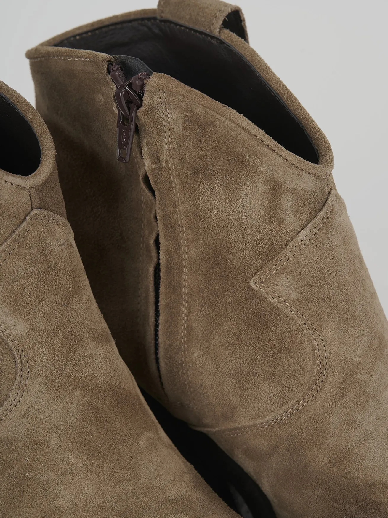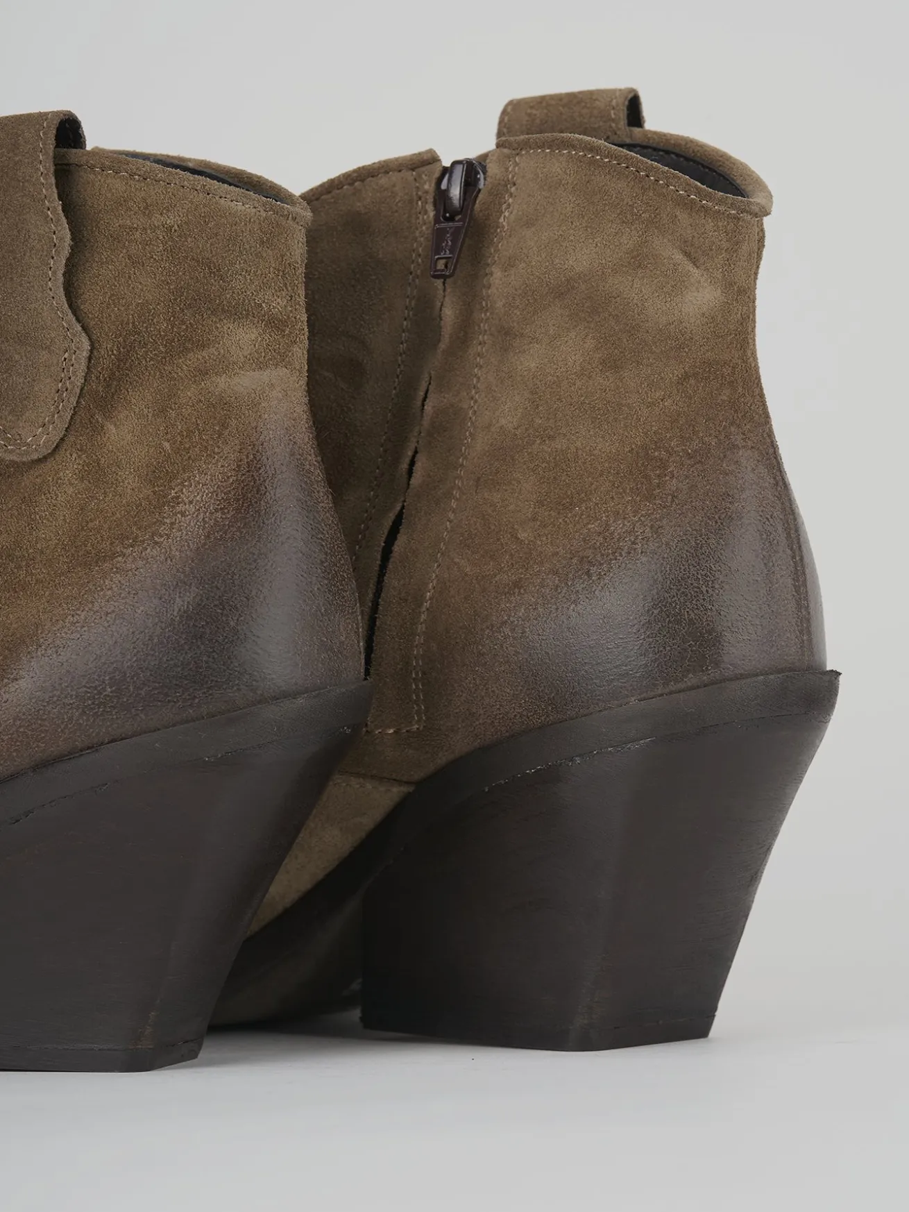stivaletto texano tacco 7 cm fondo in gomma e soletto interno in vera pelle. tomaia in morbida pelle scamosciata e anticata effetto vintage, punta sfilata, comoda cerniera laterale, tacco cuban per un look cool.
