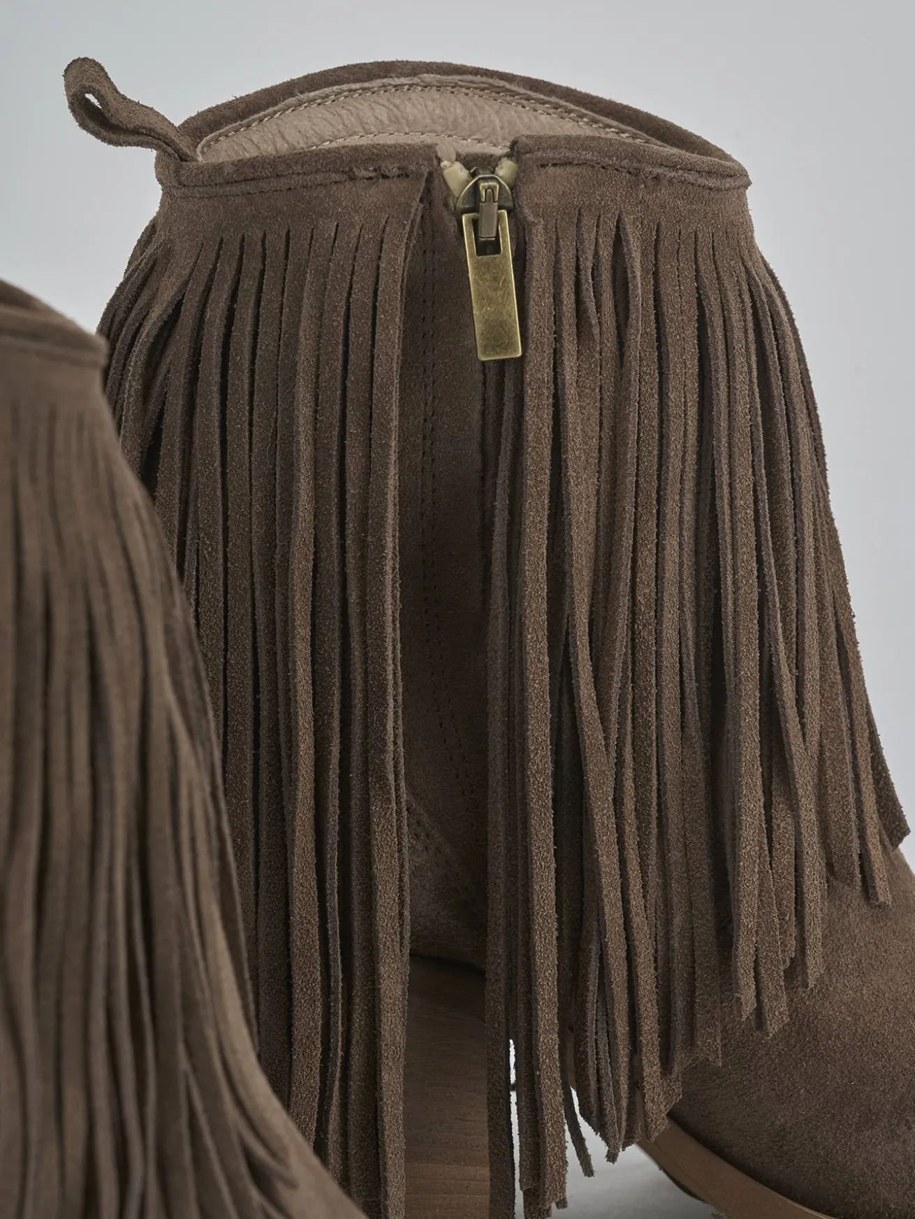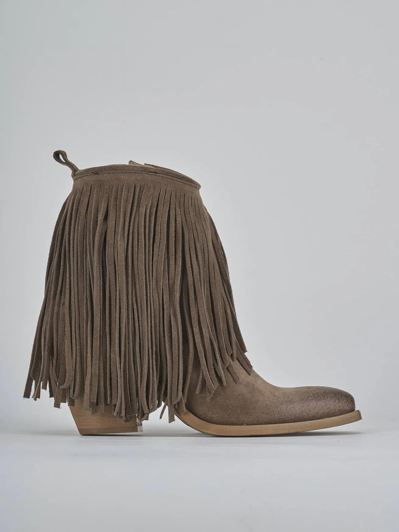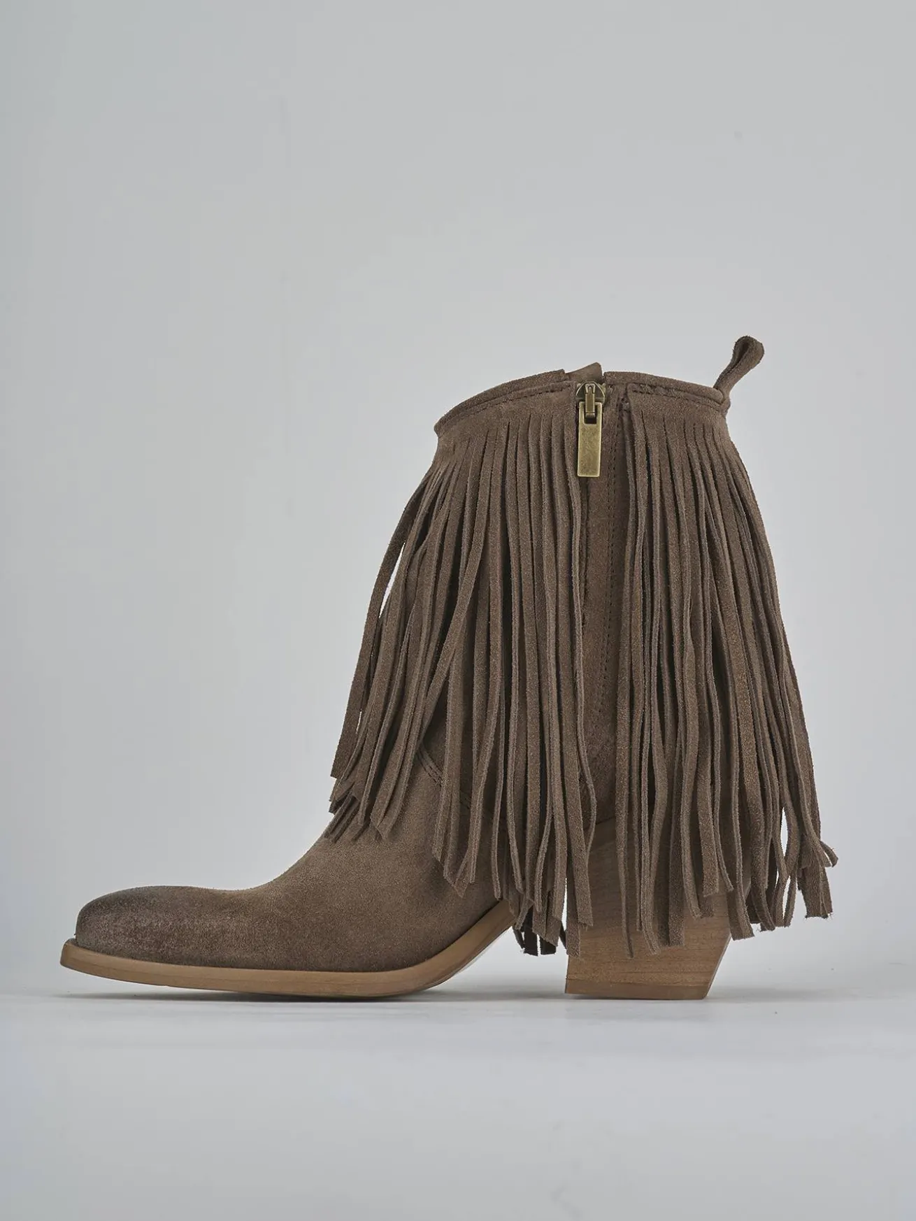 Stivaletto teano tacco 7 cm fondo in gomma e soletto interno in vera pelle. Tomaia in morbida pelle scamosciata, punta sfilata, frange lunghe, comoda cerniera laterale e tacco cubano. Apertura svasata davanti e guardolo sporgente. Perfetto con un paio di jeans e una camicia.