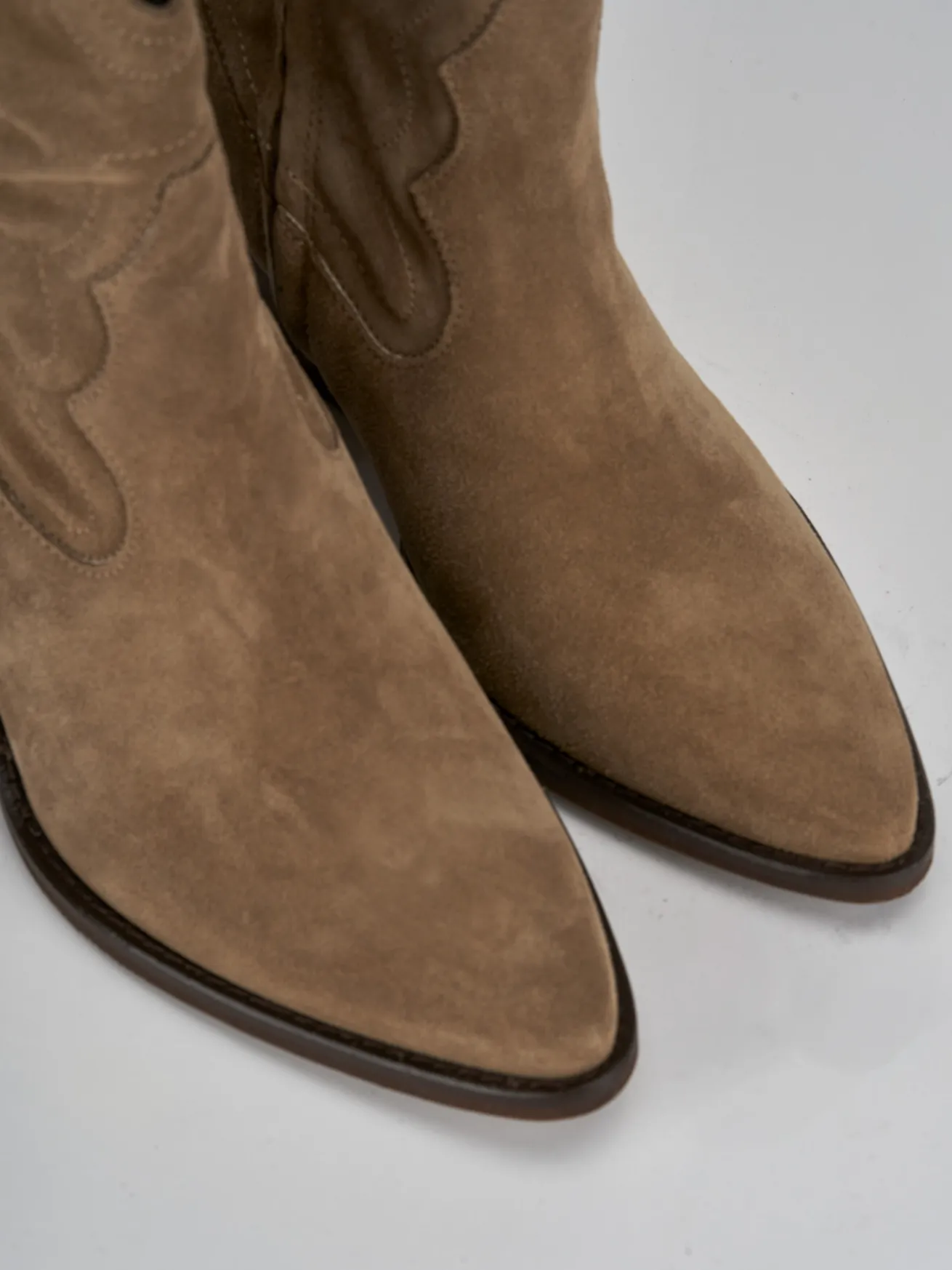 Stivaletto texano tacco 6.5 cm fondo in leggera gomma e soletto interno in vera pelle. Tomaia in morbido camoscio, punta sfilata, cuciture a mano, ghette che mantengono la struttura del gambale che misura a 3/4 del polpaccio, cerniera laterale e tacco cubano. Perfetto in qualsiasi stagione grazie alla sua versatilità.