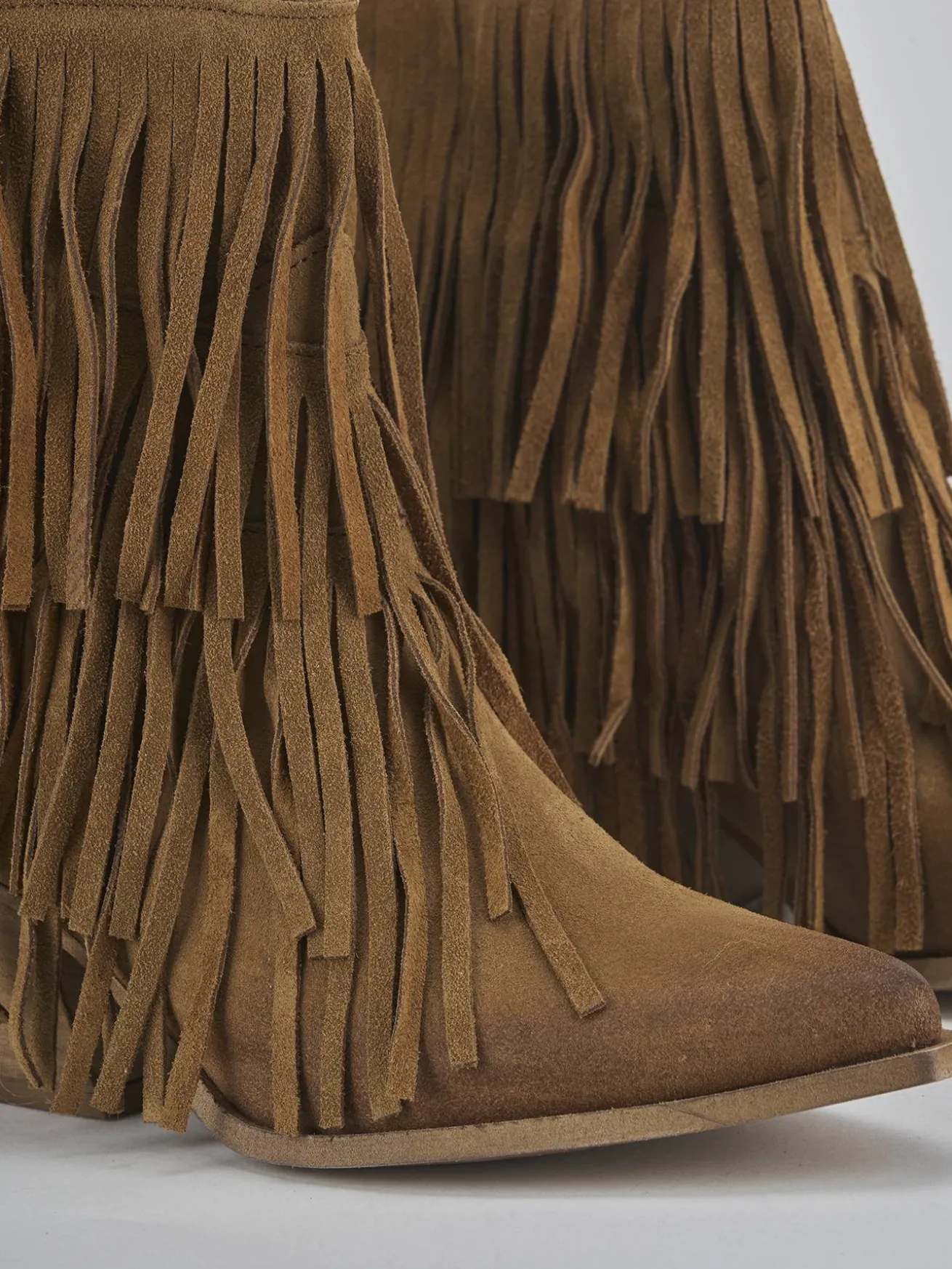 Stivaletto texano tacco 7 cm fondo in leggera gomma e soletto interno in vera pelle. Tomaia in morbido camoscio, punta sfilata, cuciture a mano, frange su entrambi i lati e tacco cubano. Guardolo leggermente sporgente. Perfetto per tutte le tue occasioni.