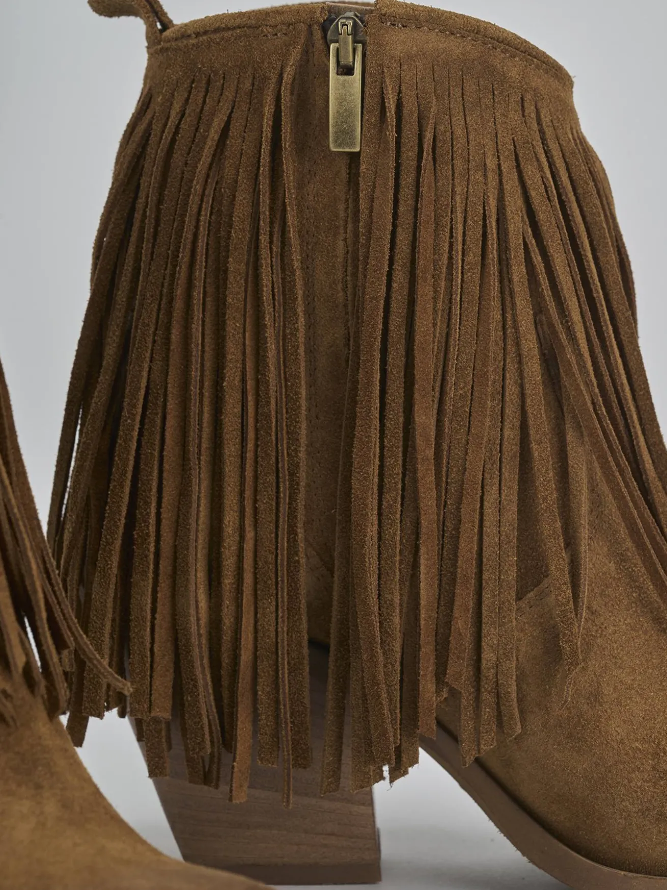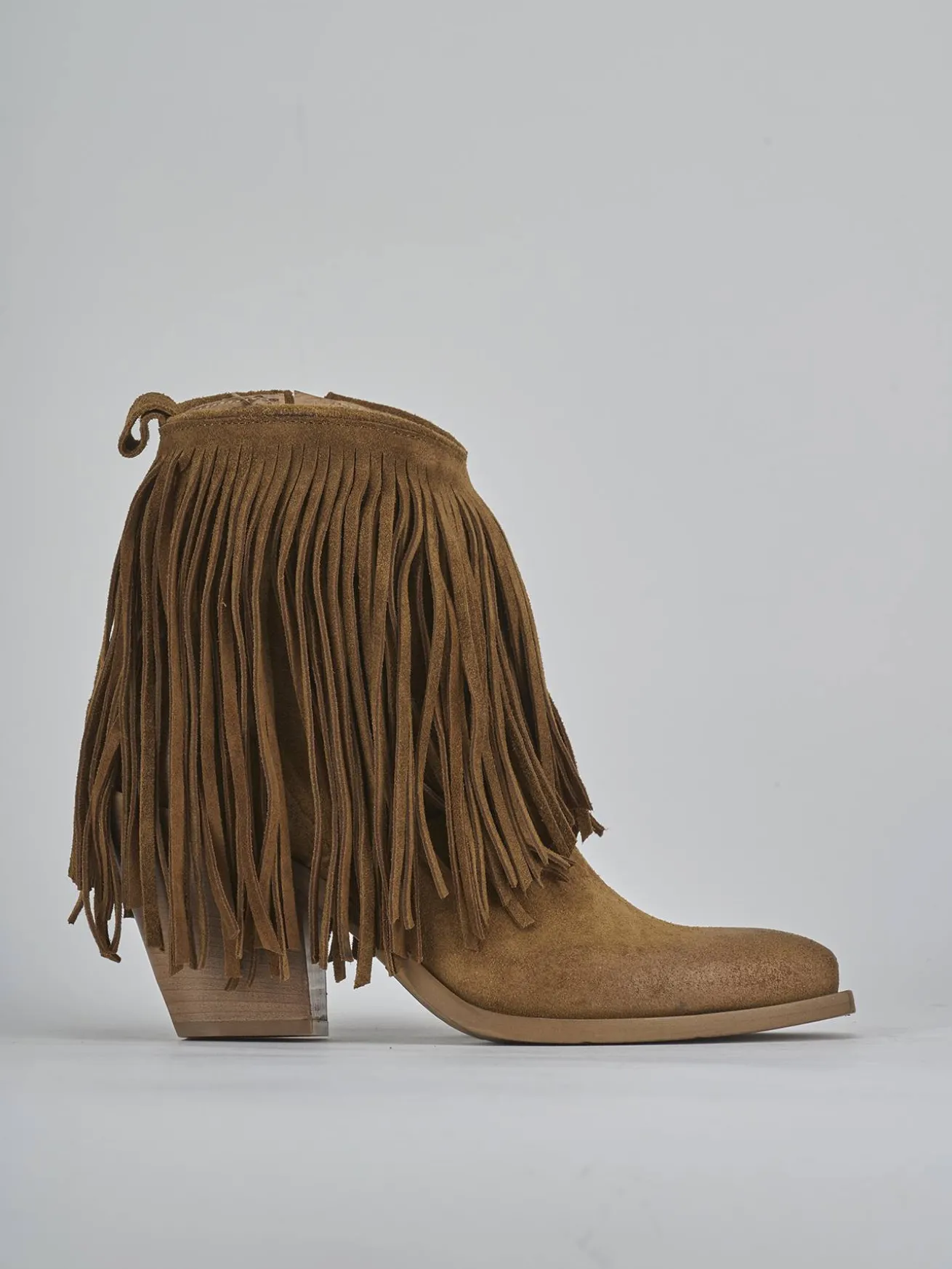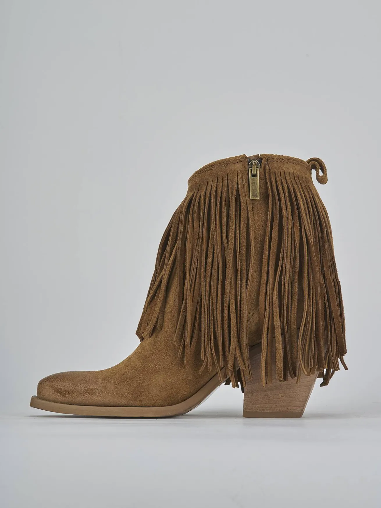 Stivaletto teano tacco 7 cm fondo in gomma e soletto interno in vera pelle. Tomaia in morbida pelle scamosciata, punta sfilata, frange lunghe, comoda cerniera laterale e tacco cubano. Apertura svasata davanti e guardolo sporgente. Perfetto con un paio di jeans e una camicia.