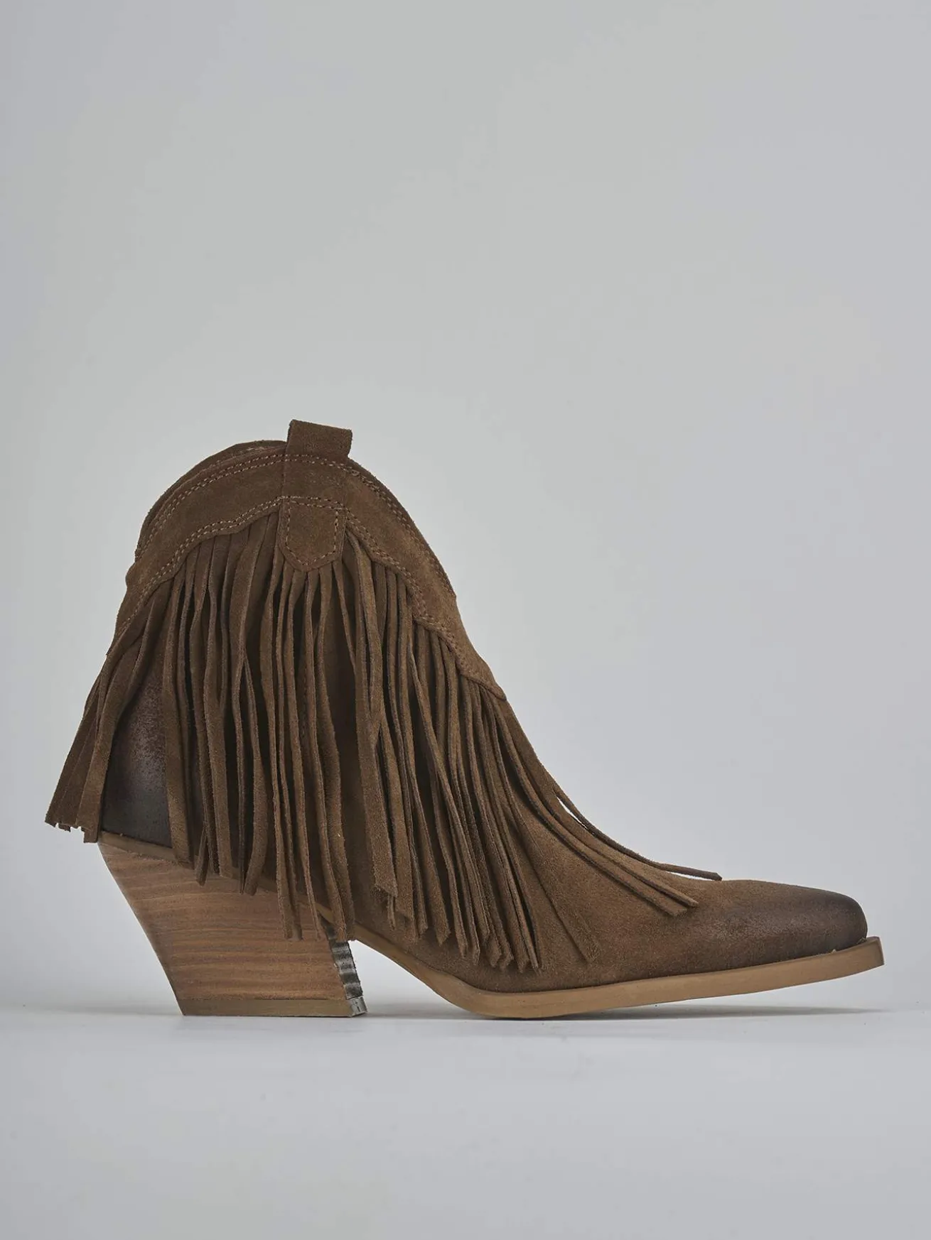 Stivaletto texano tacco 7 cm fondo in cuoio e soletto interno in vera pelle. Tomaia in morbido camoscio, punta sfilata, cuciture a mano visibili, frange, apertura a ‘V’ frontale, comoda cerniera laterale. Tacco cubano e guardolo leggermente squadrato per il perfetto tex look!