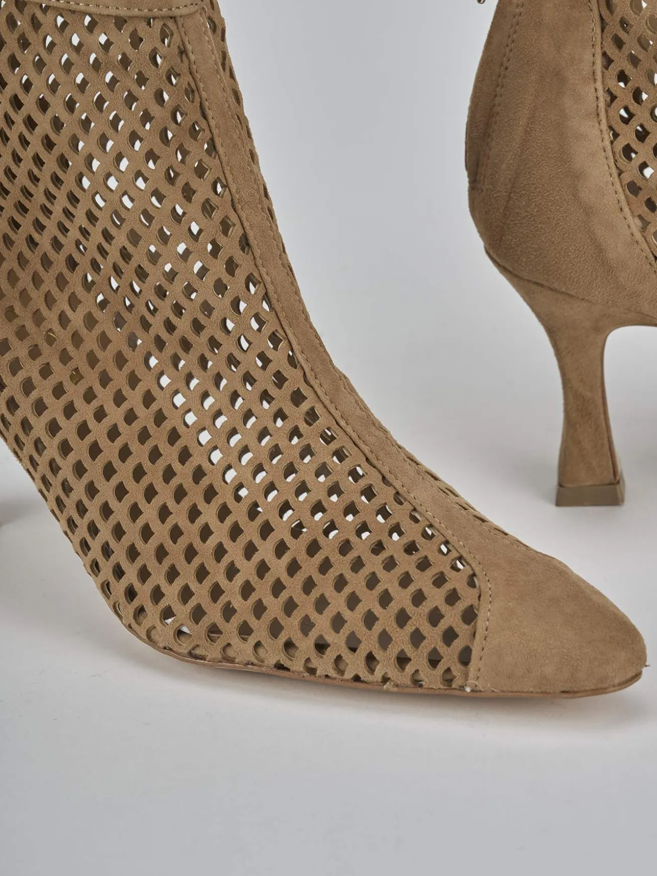 Stivaletto tacco 7 cm fondo in leggera gomma e soletto interno in vera pelle. Tomaia in morbida camoscio forato, punta sfilata, puntale ton sur ton, liscio, comoda cerniera posteriore e tacco rocchetto per un look chic.