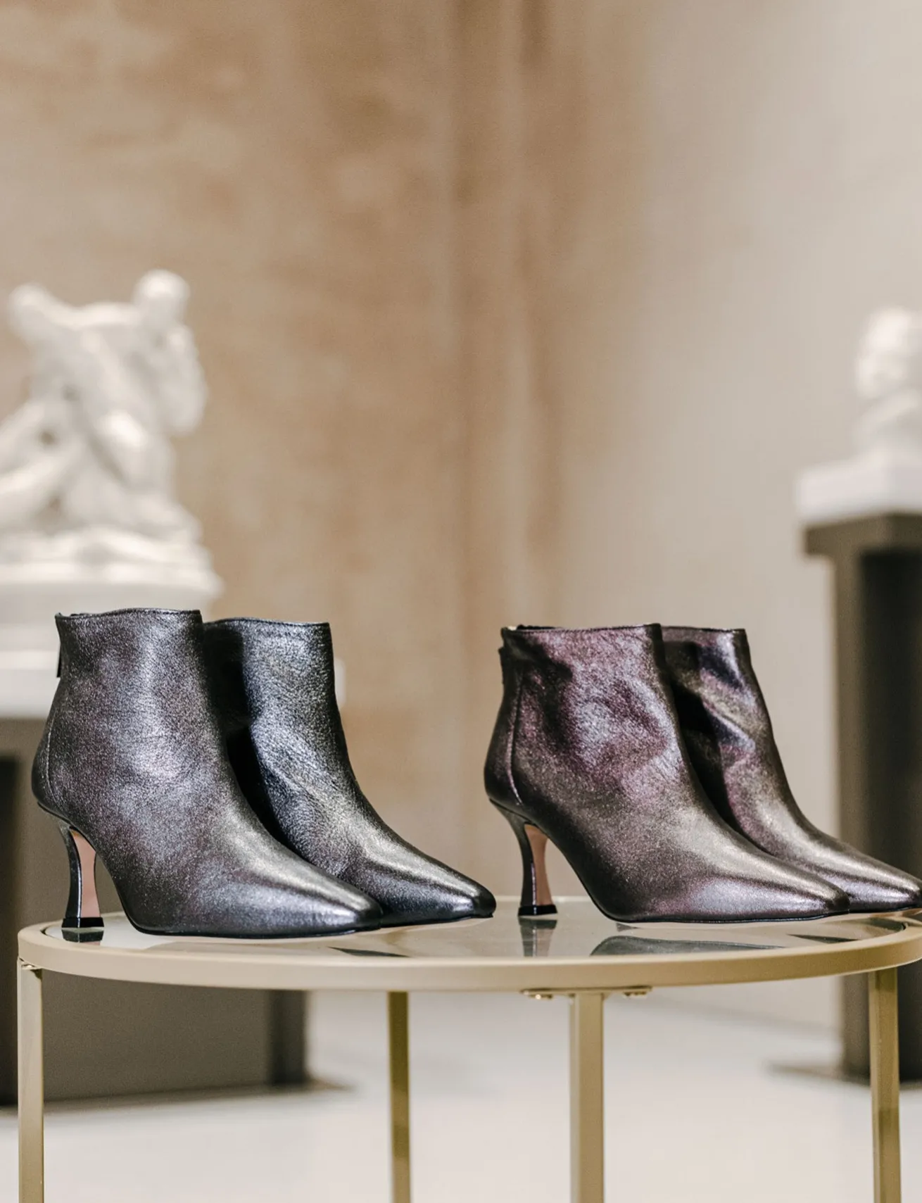 Stivaletto tacco 7 cm fondo in leggera gomma e soletto interno in vera pelle. tomaia in morbida pelle laminata nuances bronzo, punta sfilata, cerniera posteriore e comodissimo tacco rocchetto. dalle linee semplici e pulite modello che dura nel tempo.