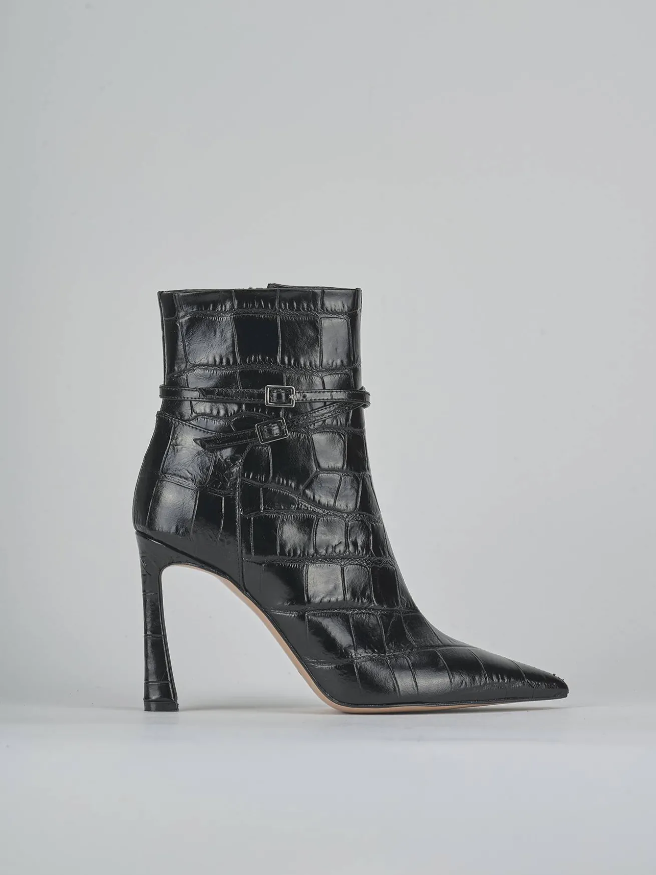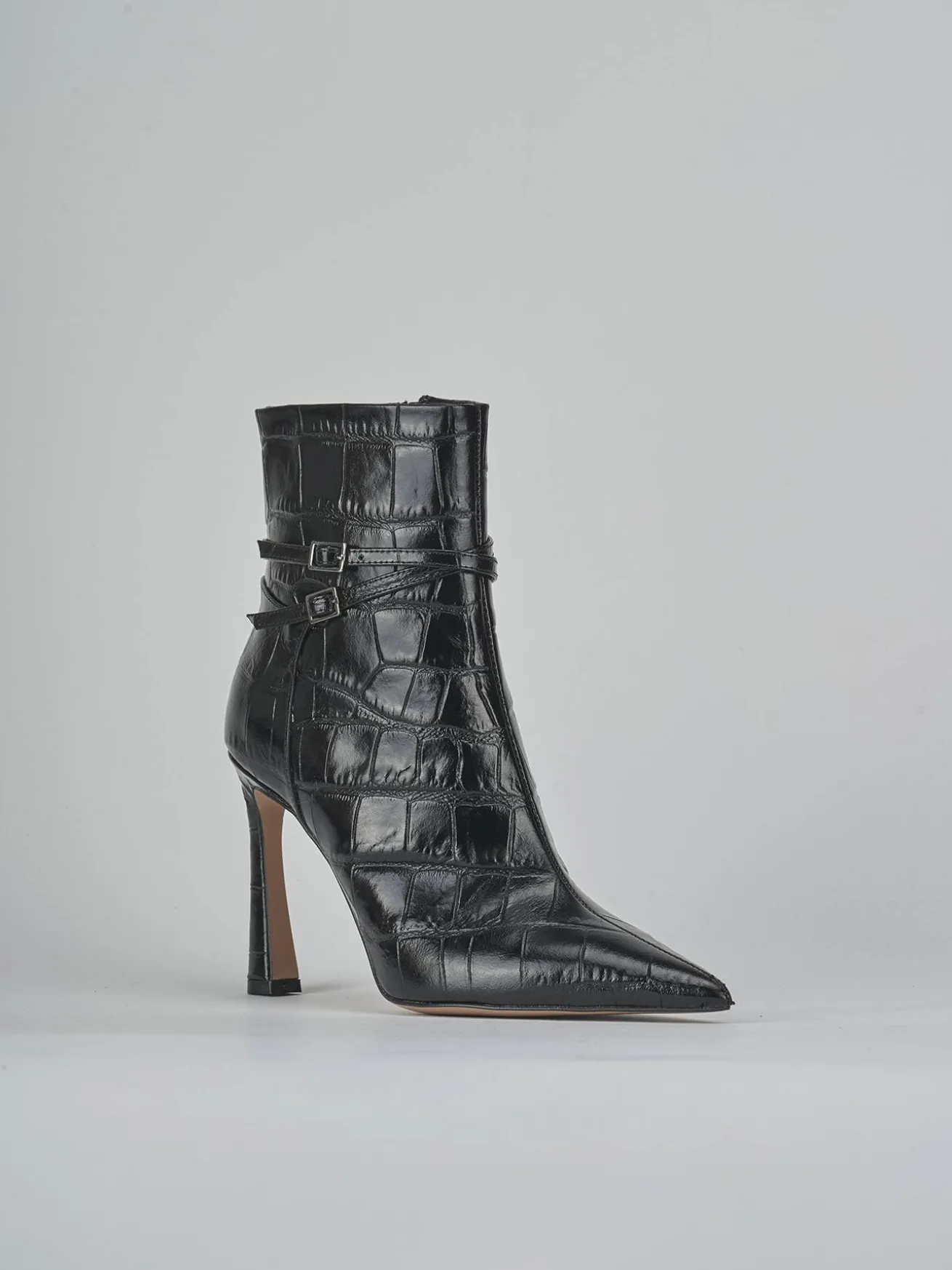 Due cinturini con fibbia regolabile incrociati sul gambale, che si ferma appena sopra la caviglia, offrono un look moderno e versatile.