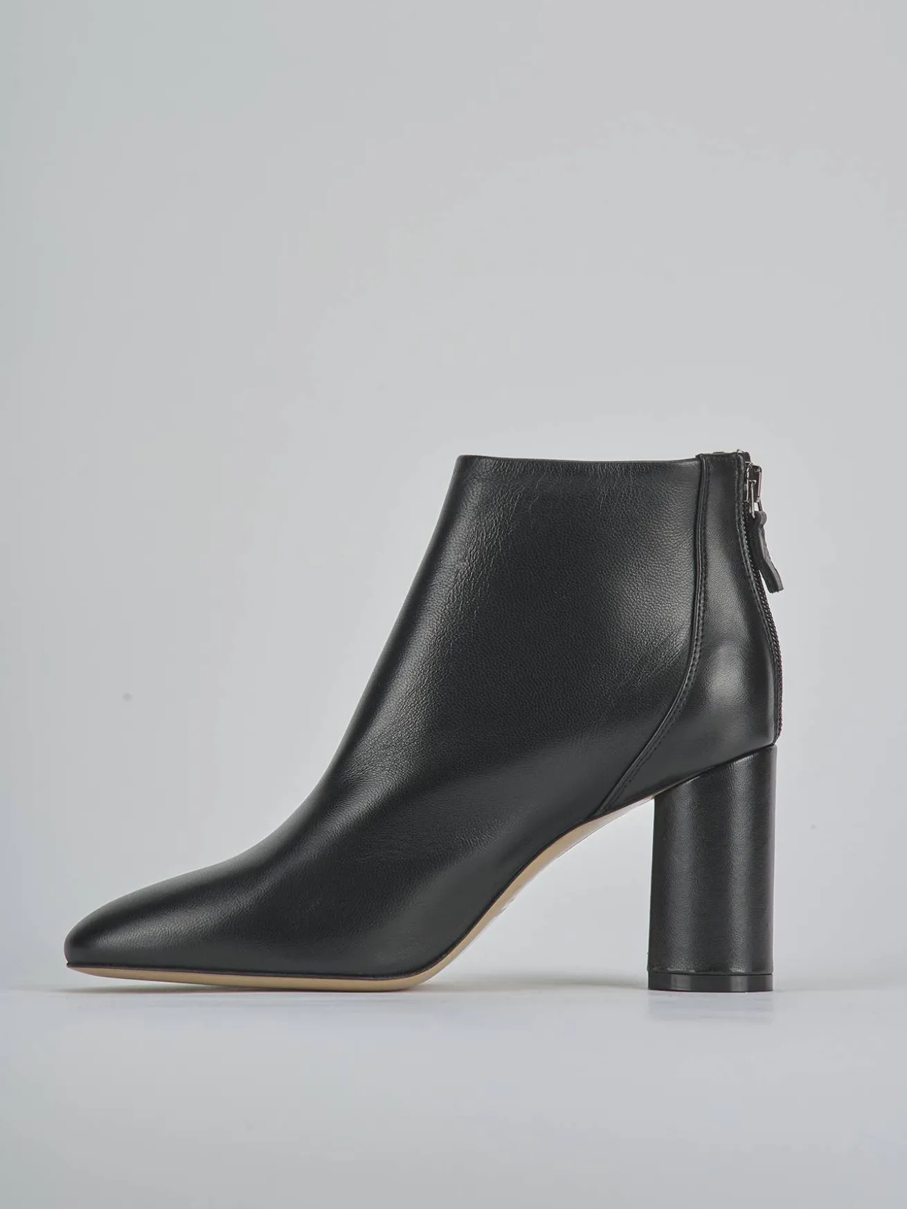 Stivaletto tacco 9 cm fondo in cuoio e soletto interno in vera pelle. Tomaia in morbida pelle, punta sfilata, cuciture, rapida chiusura con cerniera posteriore e tacco grosso. Perfetto sia con una gonna e maglia che con dei jeans vintage.