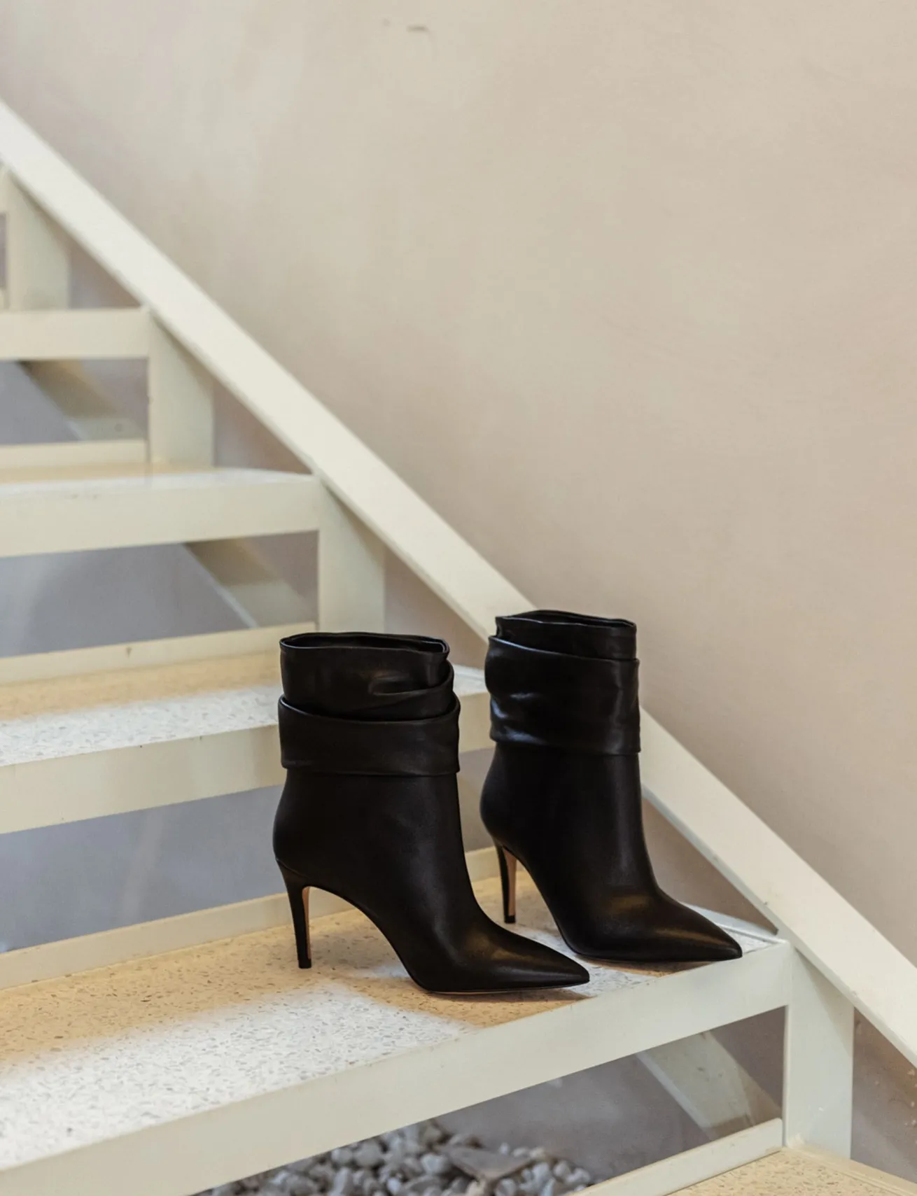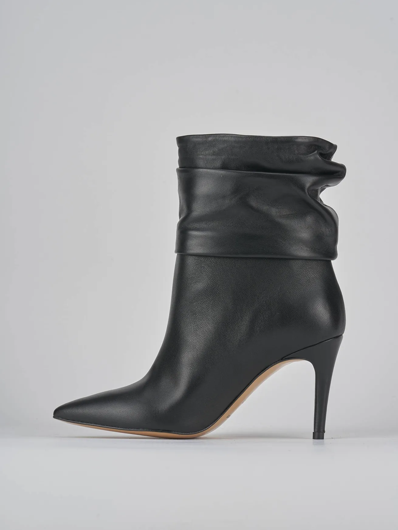 Stivaletto tacco 8.5 cm fondo in gomma e soletto interno in vera pelle. tomaia in morbida pelle, punta sfilata, tomaia arricciata in caviglia e tacco fino per un look cool-chic.