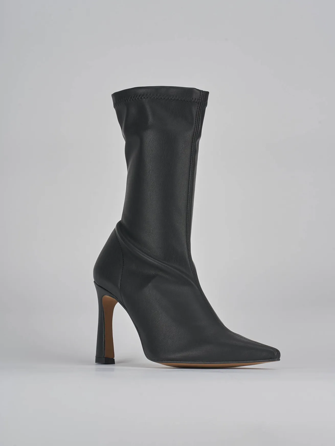 tronchetto tacco 9 cm fondo in gomma e soletto interno in vera pelle. tomaia in morbida pelle, punta sfilata, gambale altezza metà polpaccio e in pelle elasticizzata e tacco fino rocchetto. perfetto con dei jeans o un vestito.