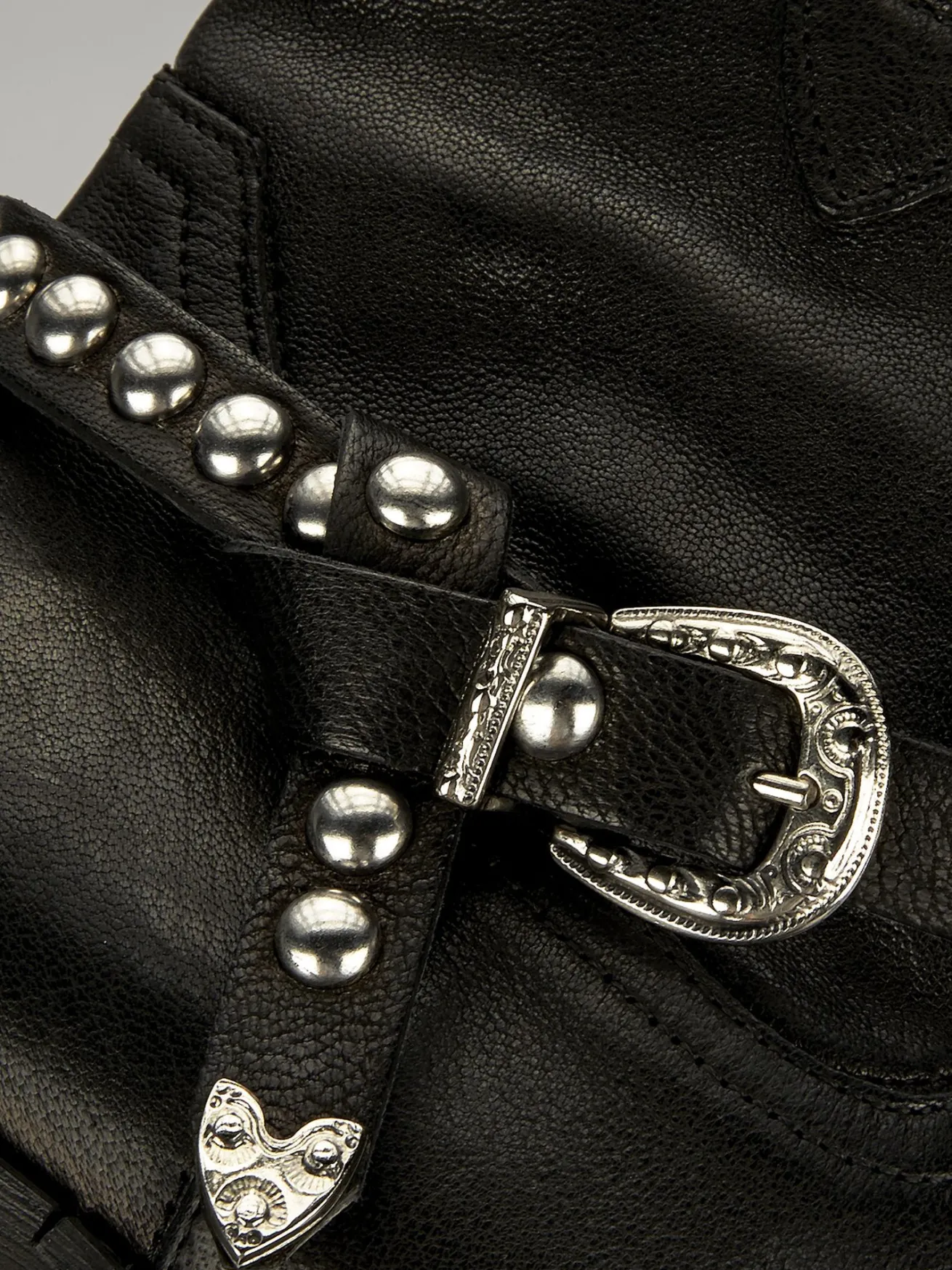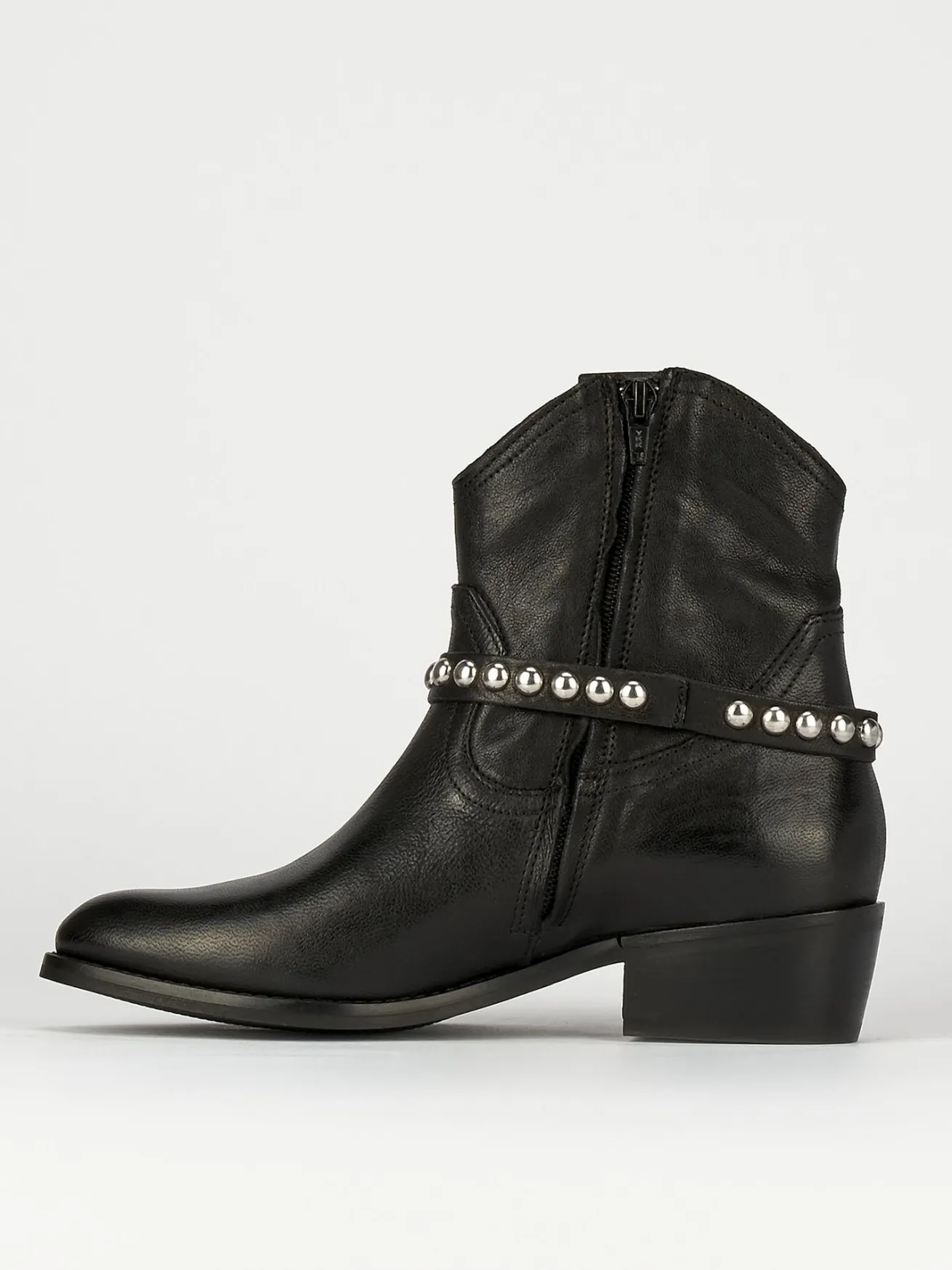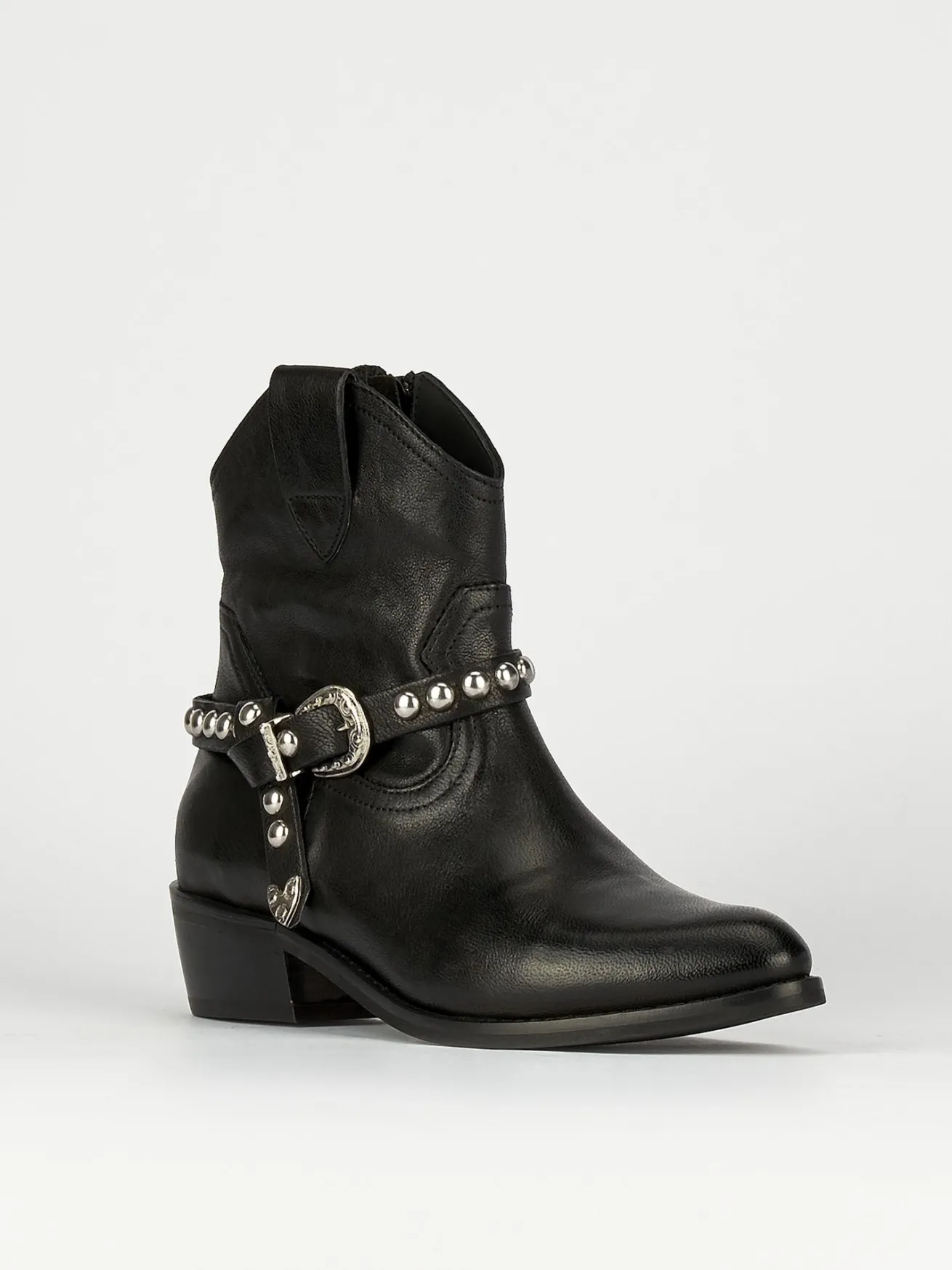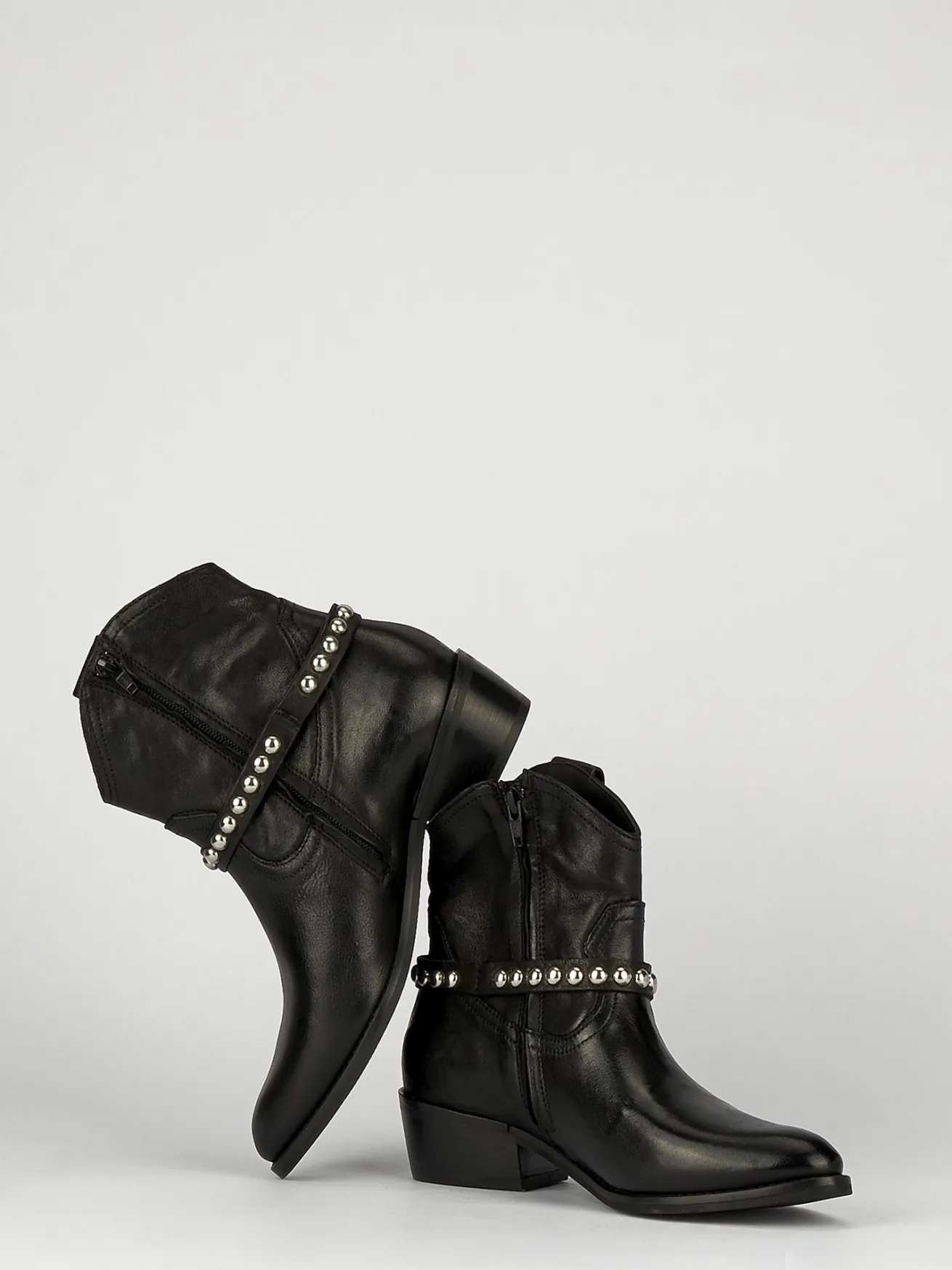 Stivaletto texano tacco 3 cm, fondo gomma e soletto interno in vera pelle. tomaia in morbida pelle, punta sfilata, comoda cernierna laterale, accessorio con borchie per un look cool.